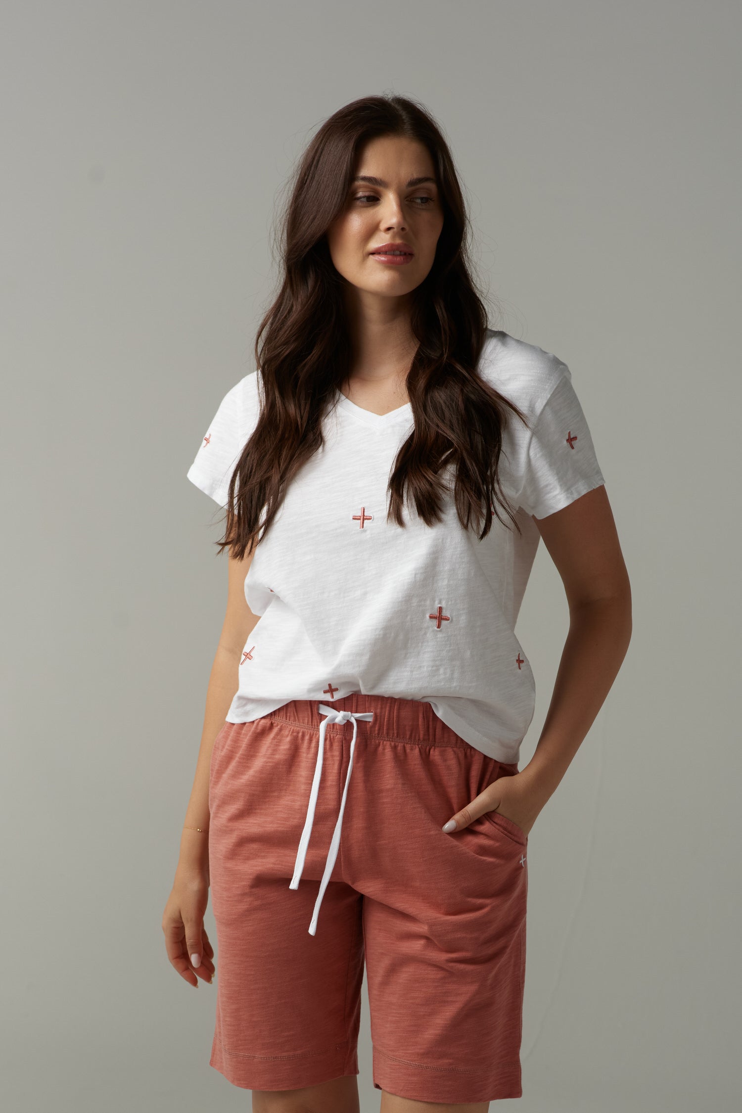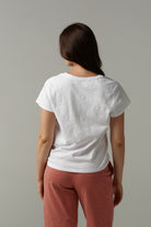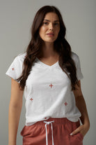 Irregular Cotton Embroidered V Neck Tee - White/Terracotta