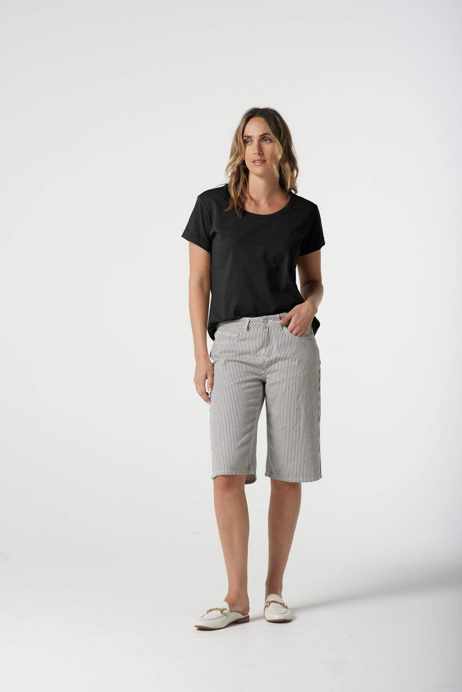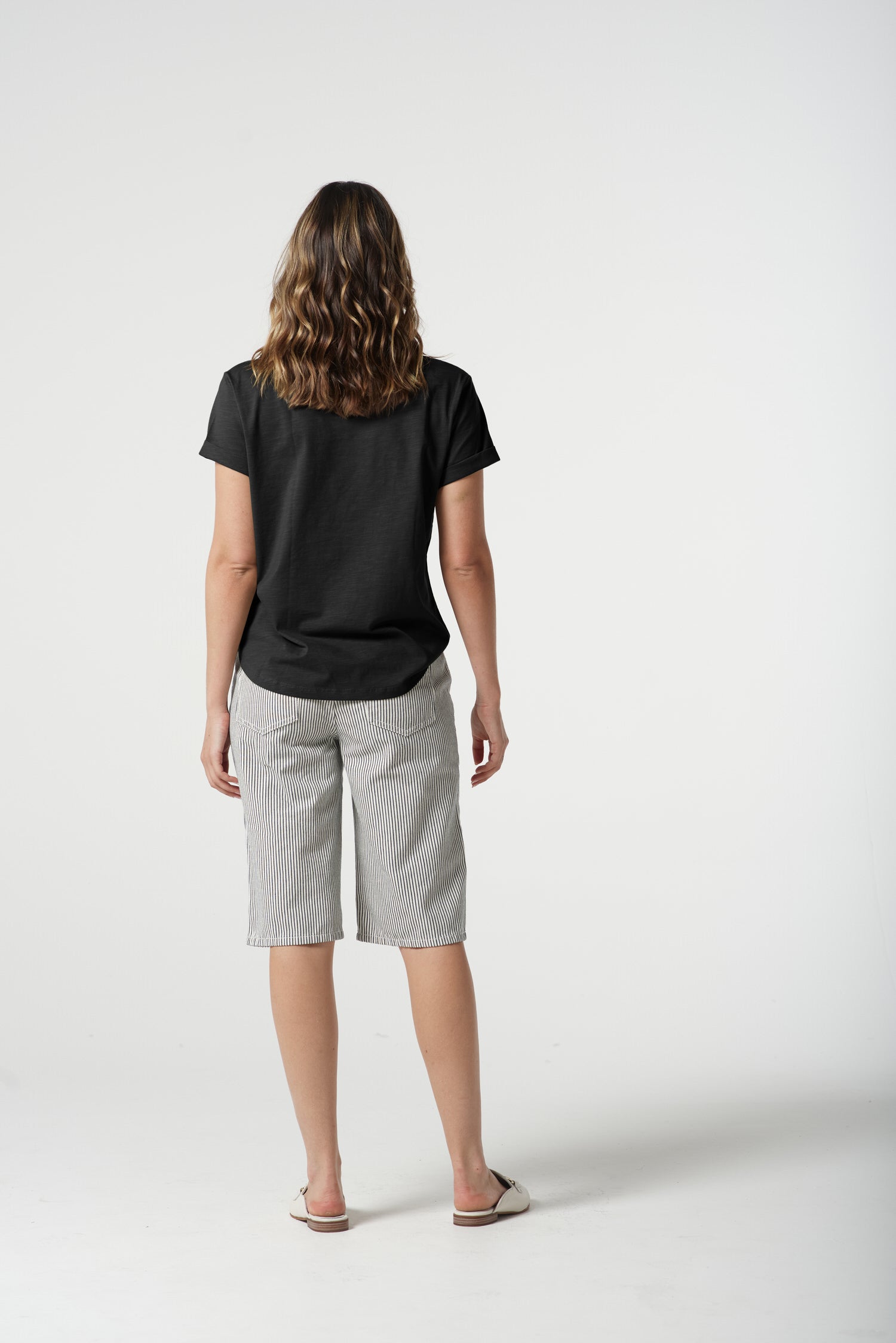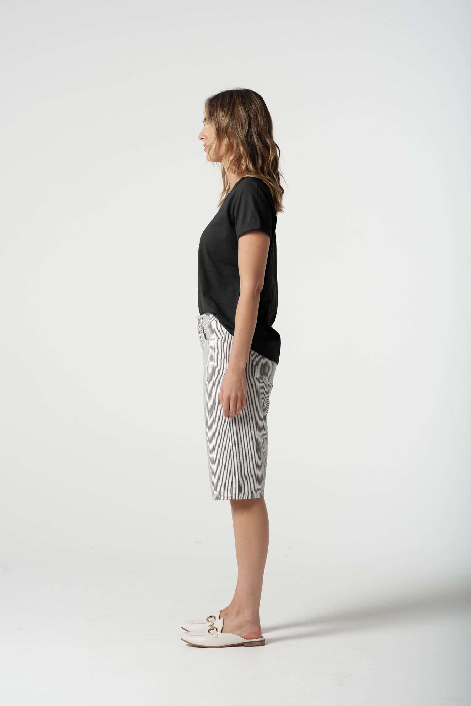 The Everyday Cotton Roll Cuff Tee in black is crafted from 100% pima cotton jersey for a soft, premium feel. With a wide round neckline, curved hem and rolled sleeve cuffs, it’s an easy everyday staple that works perfectly with denim, shorts or skirts.