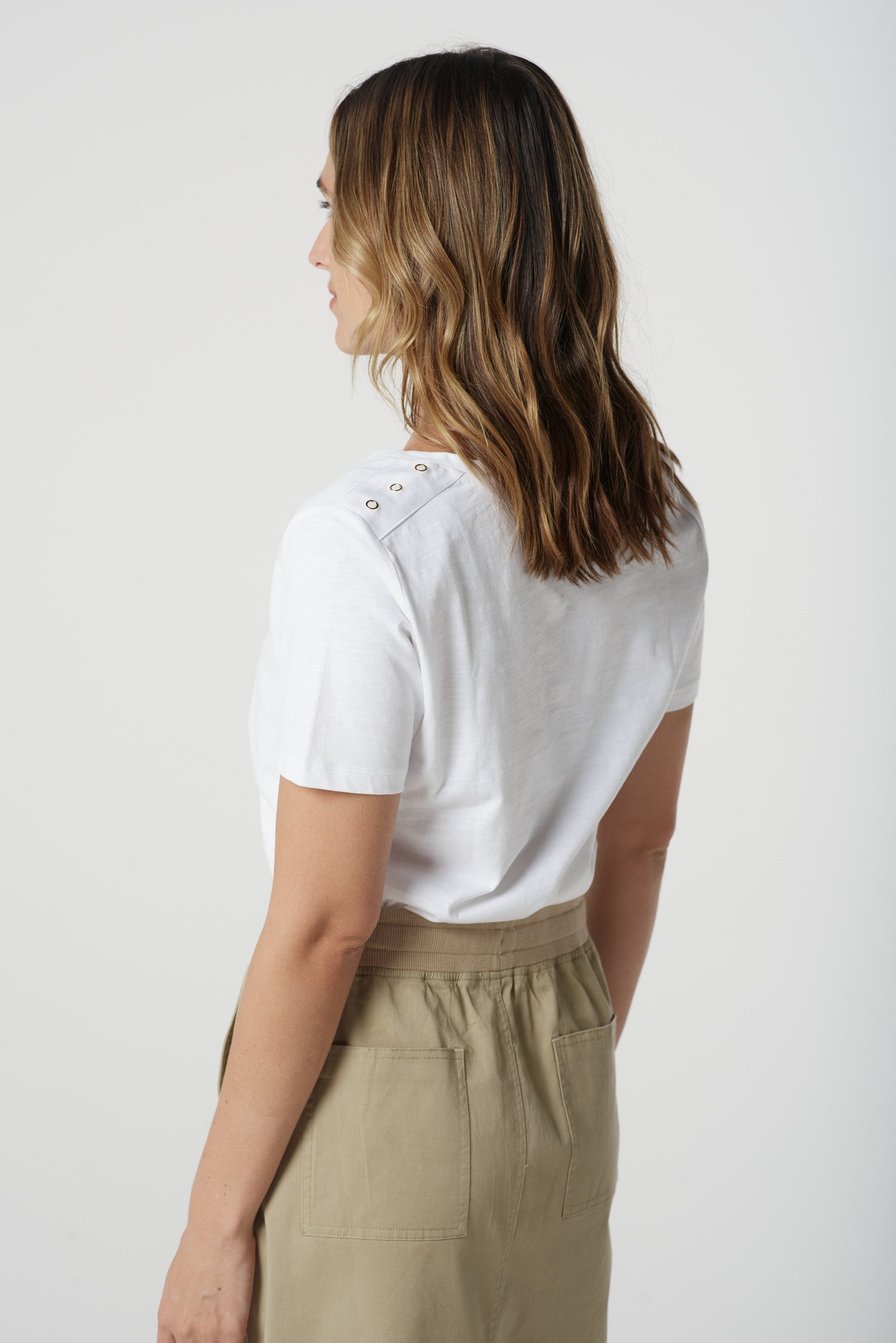 The Heat Cotton V Neck Tee in white is crafted from 100% pima cotton jersey for a soft, premium feel. Designed with a wide V-neckline and a special stud feature on the shoulder panel, it’s finished with a straight hem for a simple yet elevated look.