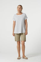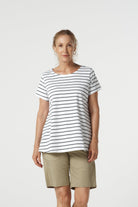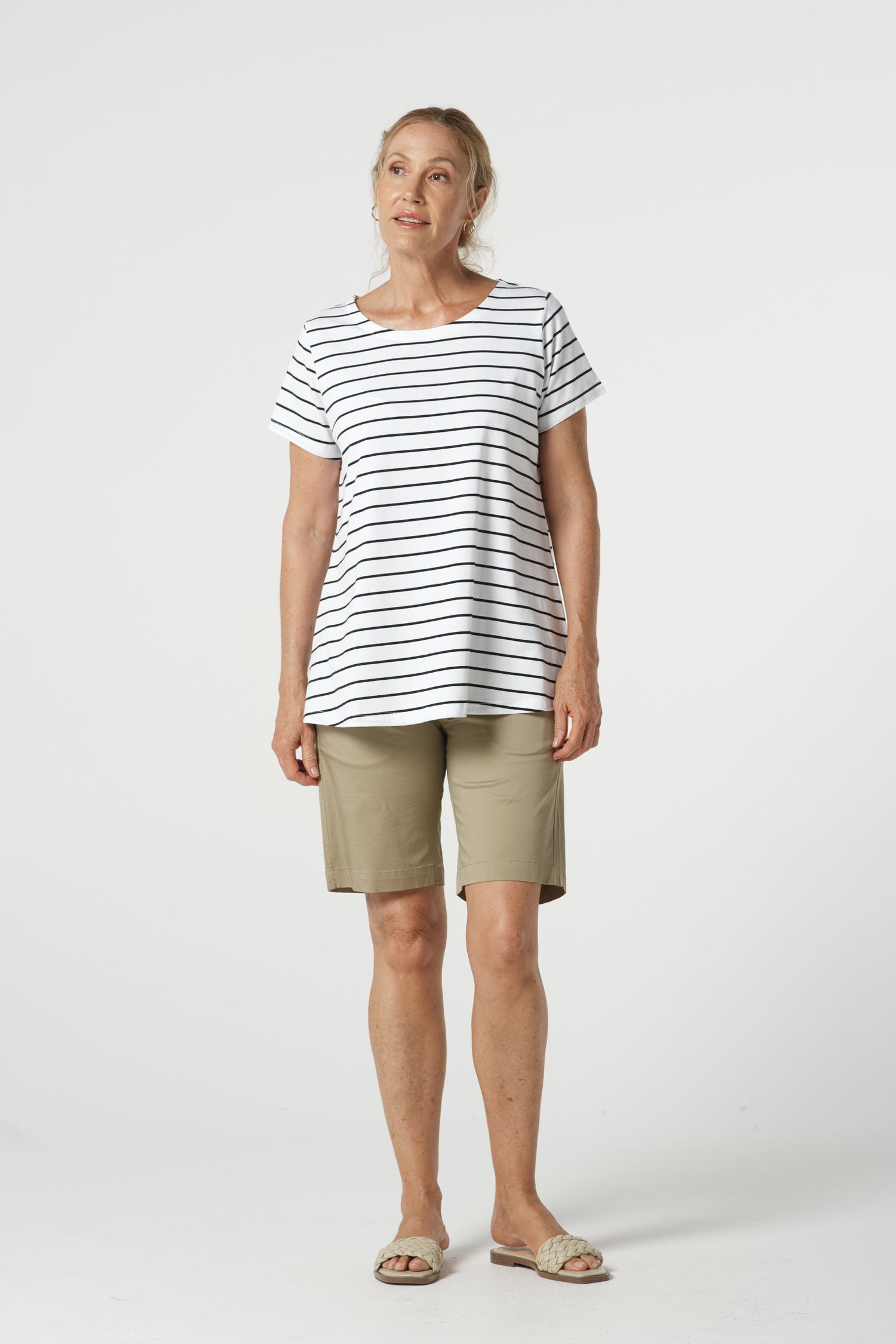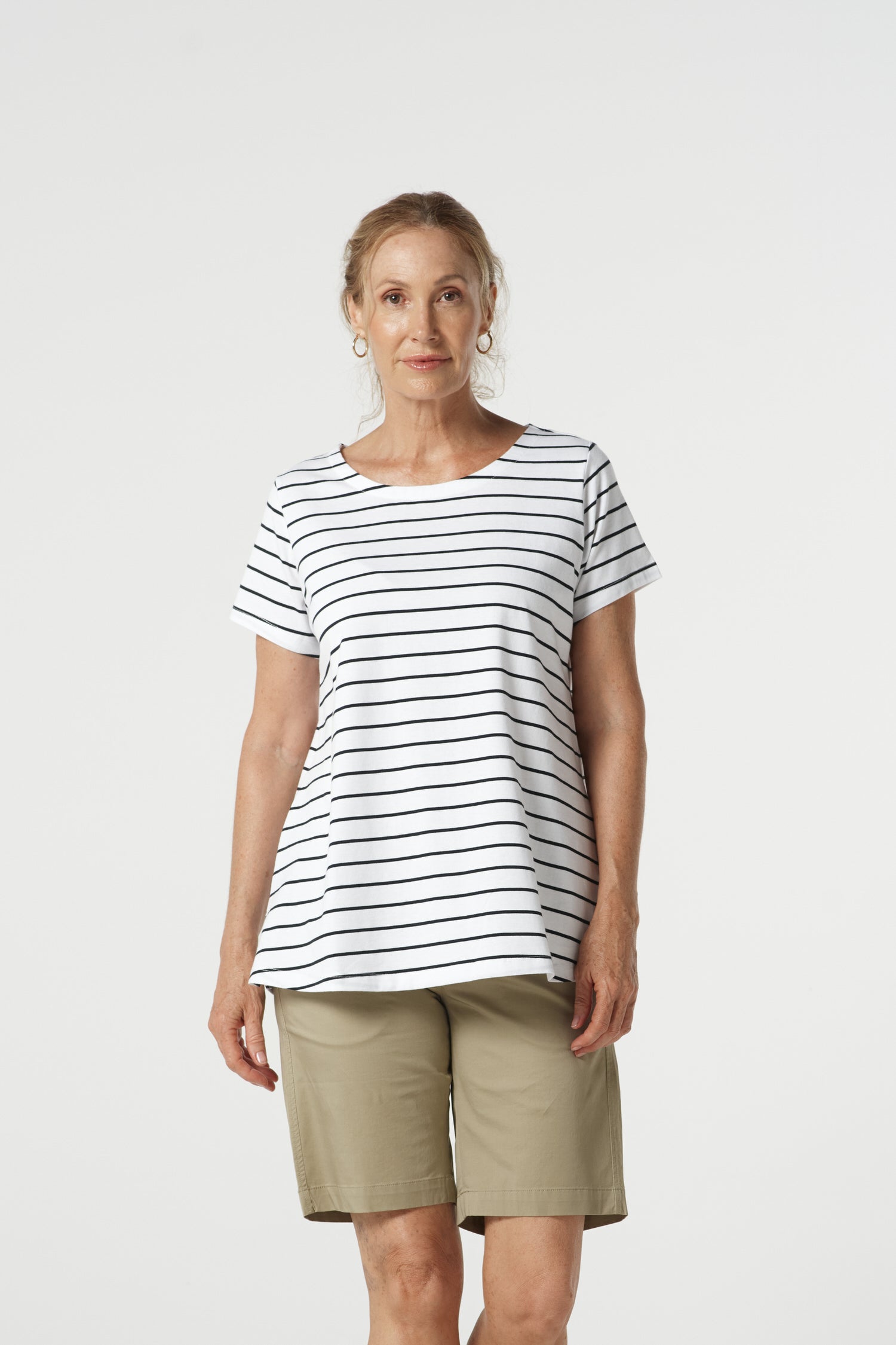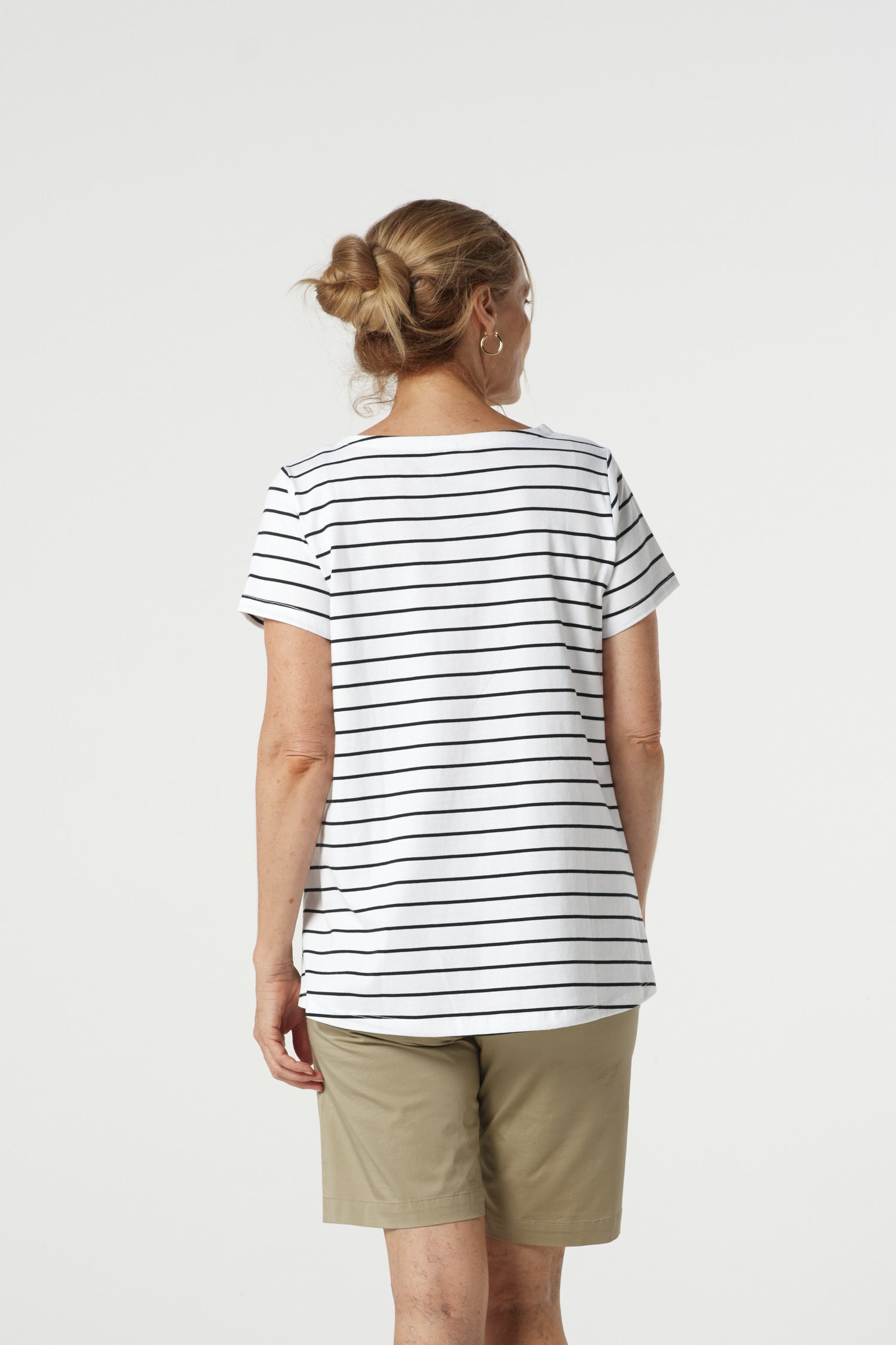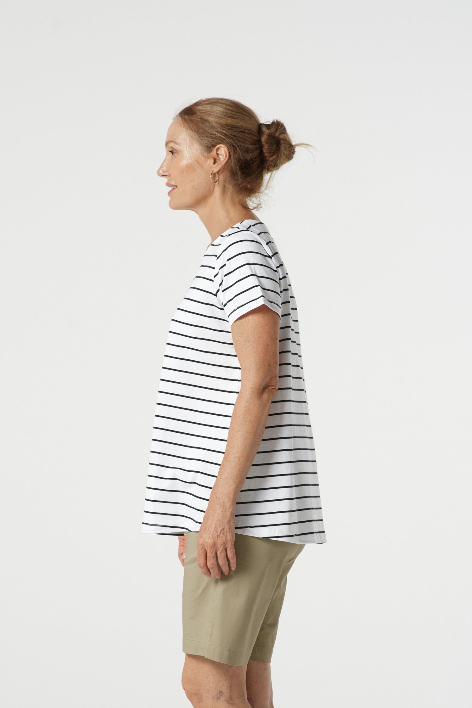 The Meadow Cotton A-Line Tee in white and navy is made from 100% pima cotton jersey in a premium yarn-dyed stripe. Designed with a boat neckline, curved hem and side seam splits, this regular fit style is soft and breathable — perfect with shorts in summer and easy to layer for transeasonal wear through all seasons.