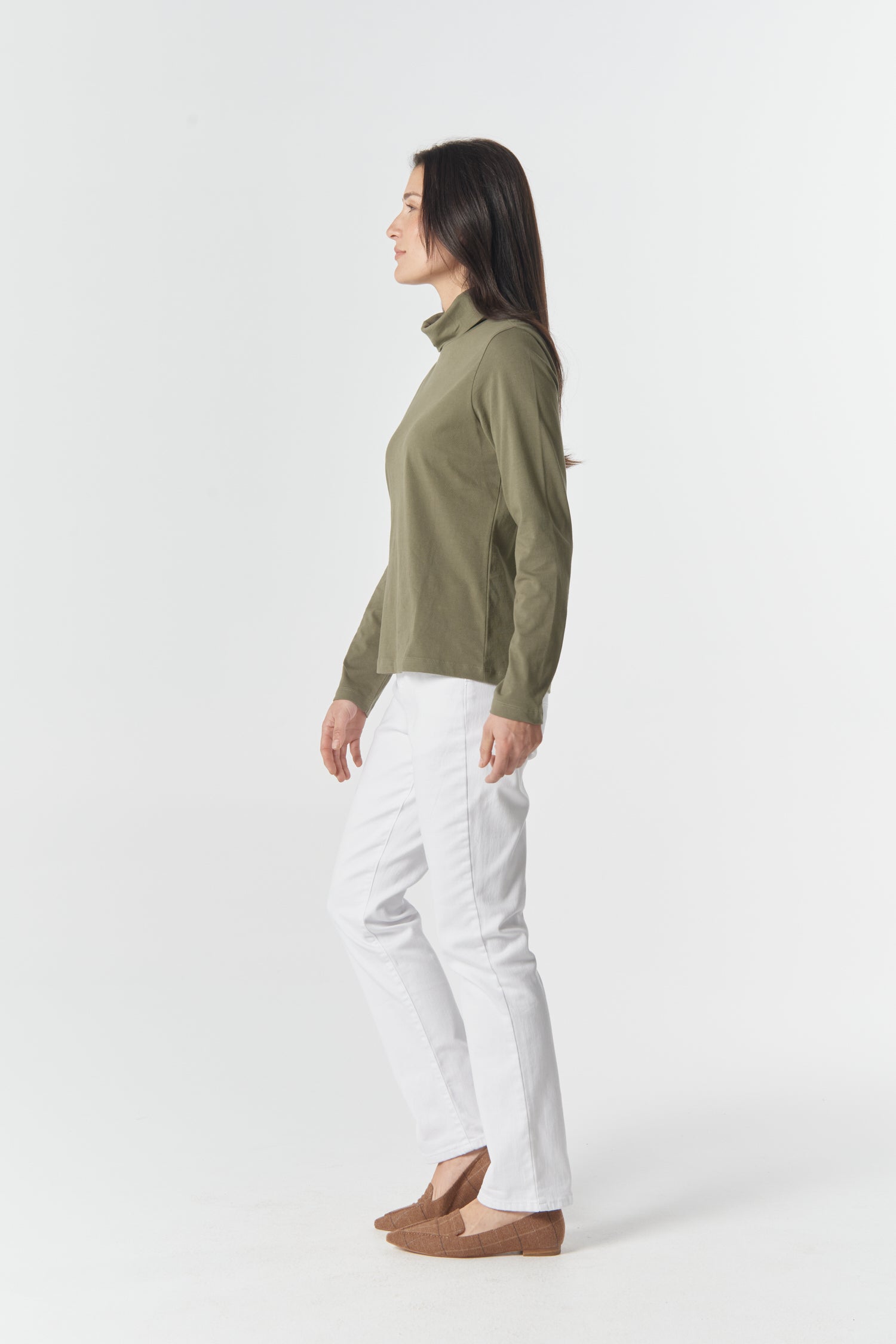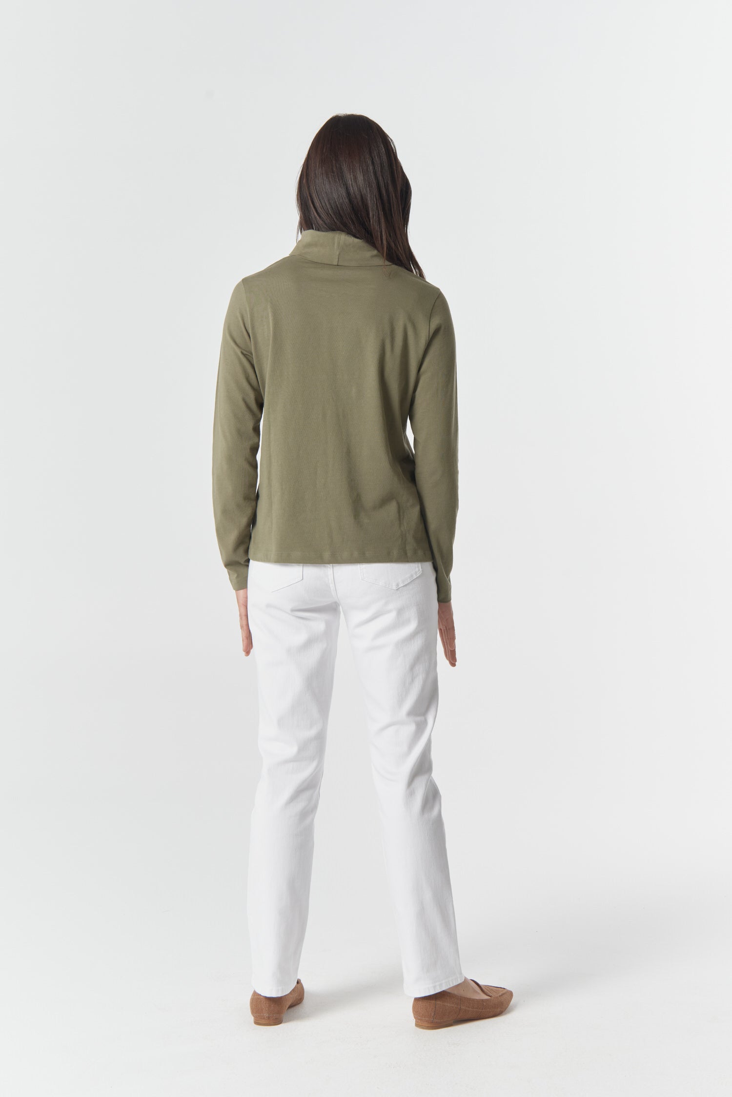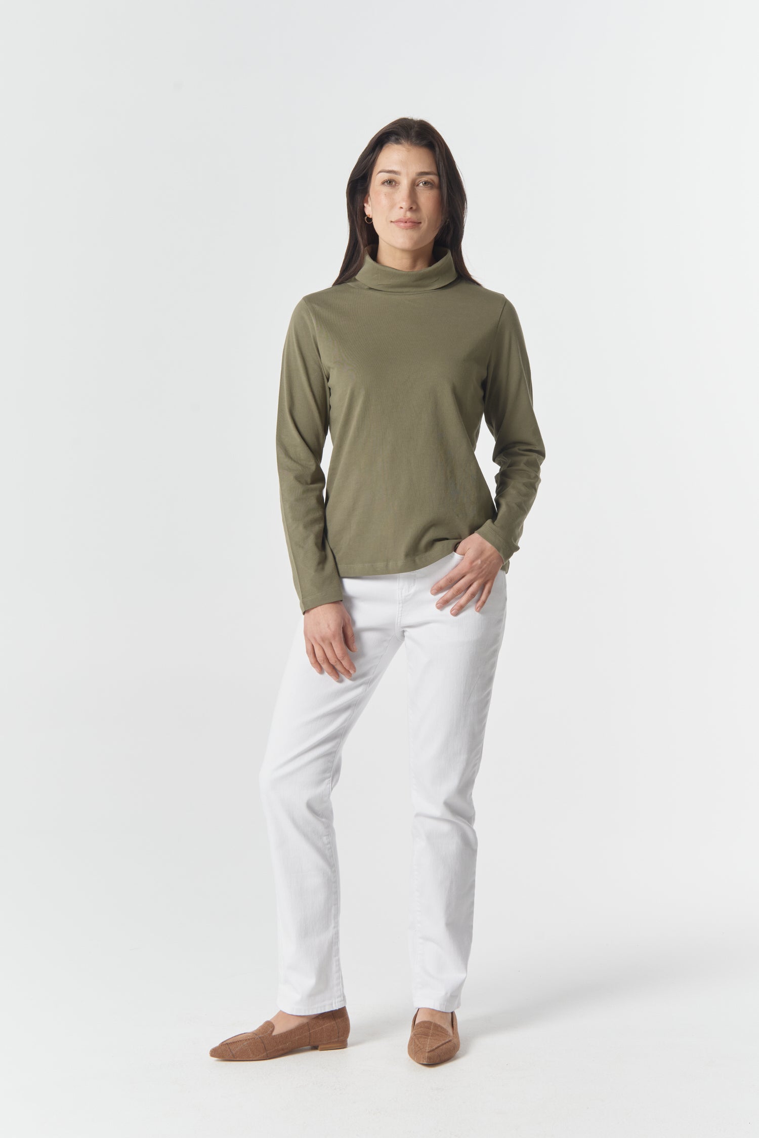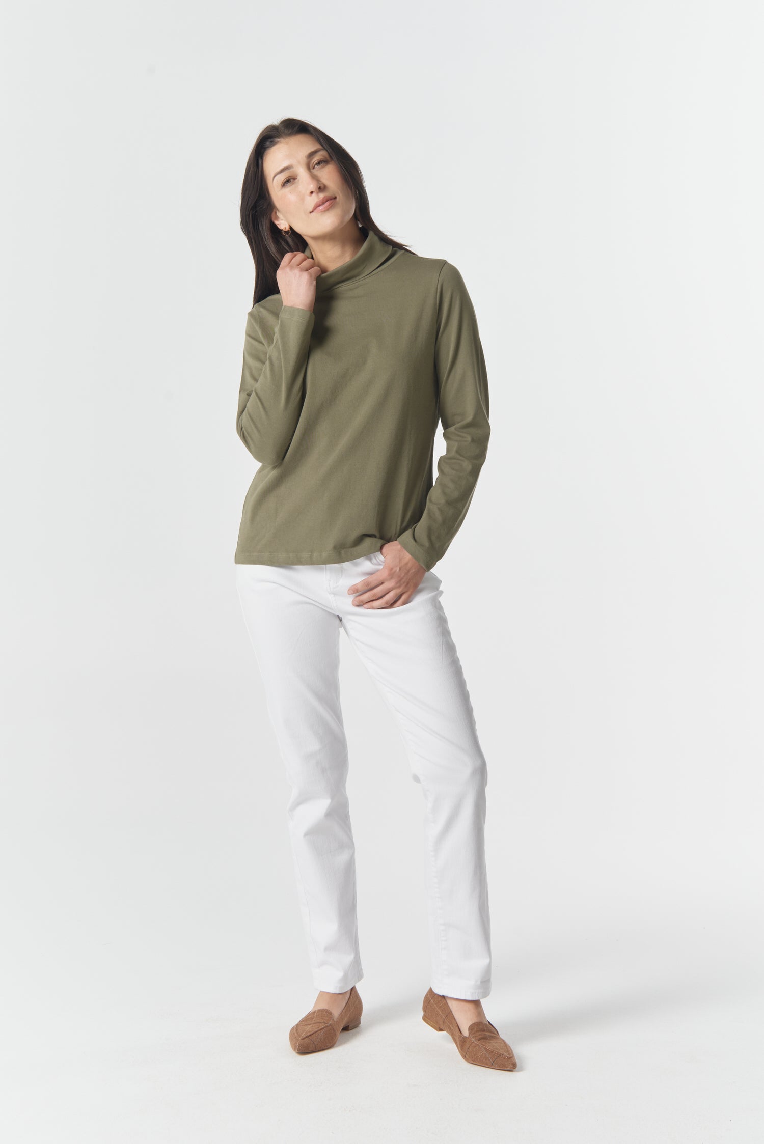 The Solid Cotton Skivvy in Sage is a timeless wardrobe essential made from Australian cotton for comfortable all-day wear. Featuring a sleek fitted silhouette and classic high neck, this versatile skivvy layers beautifully under jackets, knitwear or dresses — or stands alone with denim or skirts for clean, minimalist style.