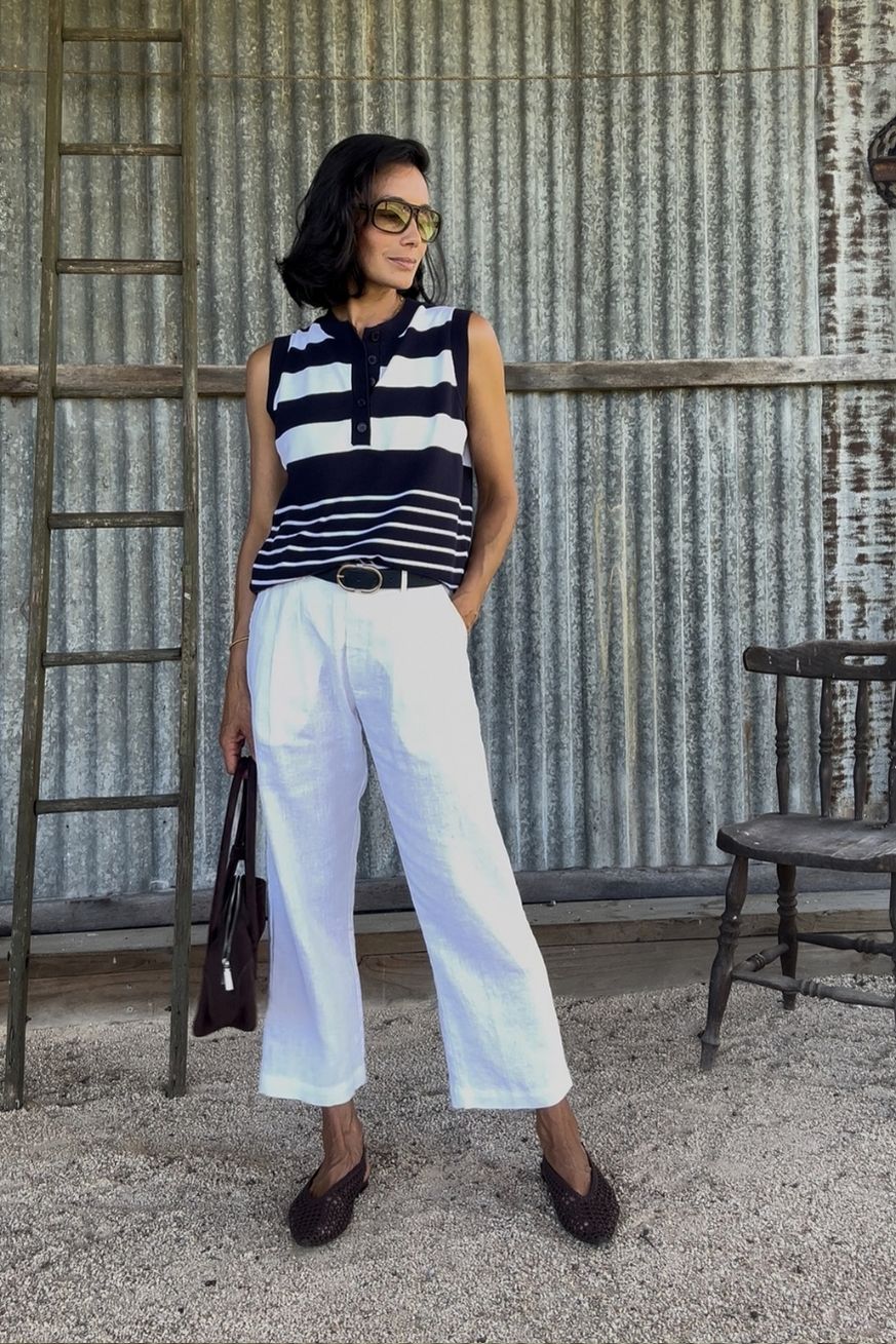 Our Staple Tailored Linen Pant in white is crafted from a  linen that offers comfort with a polished finish. Featuring a straight-leg cut and tailored detailing, it’s a versatile wardrobe essential that pairs effortlessly with shirts, knits or relaxed tees.