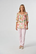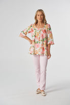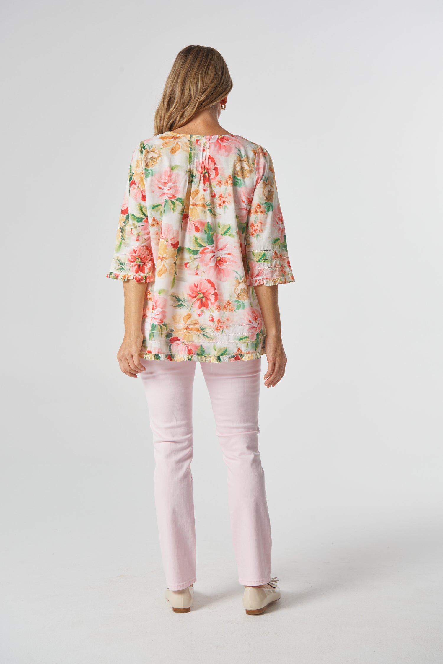 The Golden Cotton Trapeze Blouse in Blurred Floral is crafted from 100% cotton for a light, breathable feel. Featuring pleat detailing at the front and delicate frill finishes on the cuff and hemline, this regular fit style is brought to life in an exclusive print inspired by native blooms of the Goondiwindi Botanic Gardens.