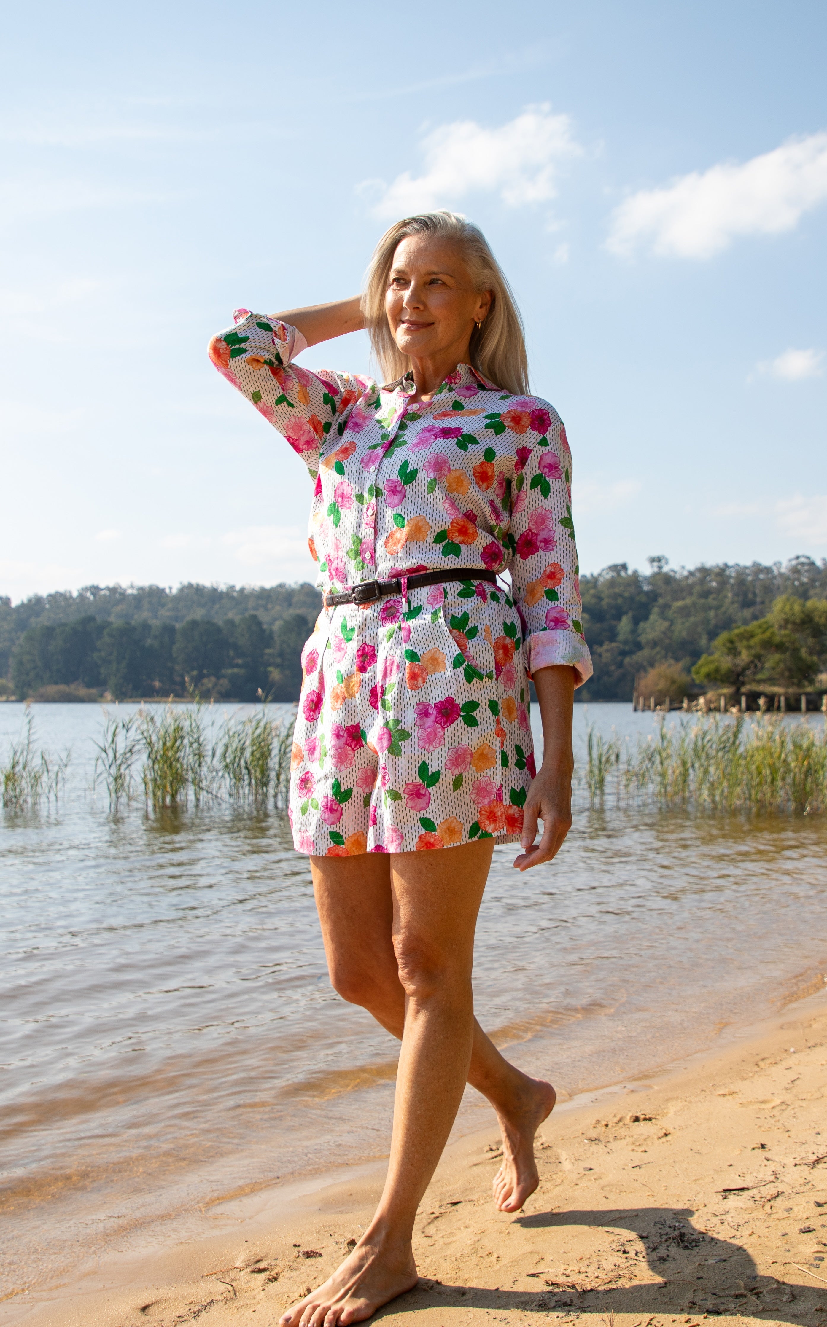 The Honey Linen Short in Floral Stitches is crafted from 100% linen for lightweight, breathable comfort. Designed in a regular fit with front pockets, belt loops, fly front opening and an elastic back waist, it’s finished in an exclusive print created in collaboration with Aqua Door Designs — a fresh, easy style for warm days and summer escapes.