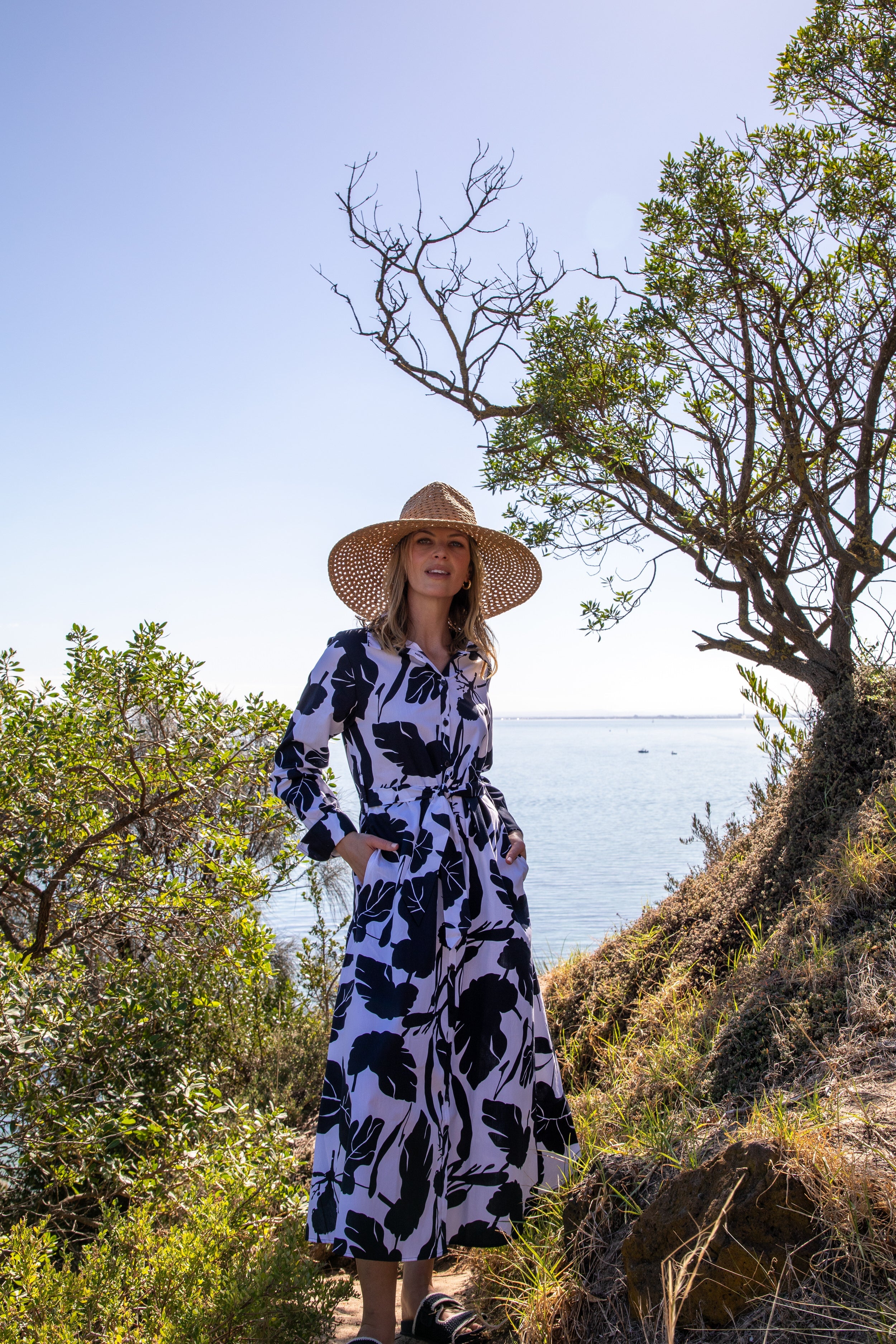 Our signature A-line belted dress returns in a fresh Block Leaf print, crafted from 100% breathable cotton for all-day comfort. Inspired by the leaves of the land, it’s a versatile style you can wear cinched at the waist with the self-fabric belt or your own belt styling, with long sleeves that roll up for a more relaxed look.