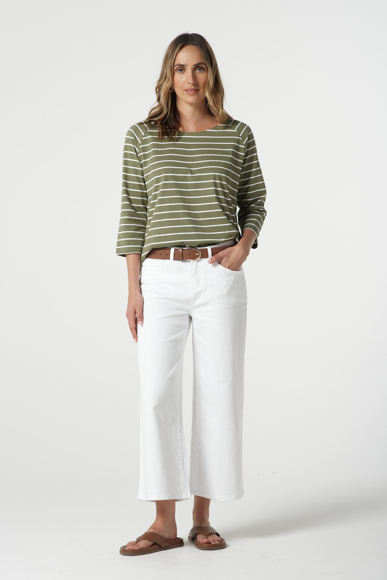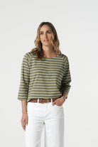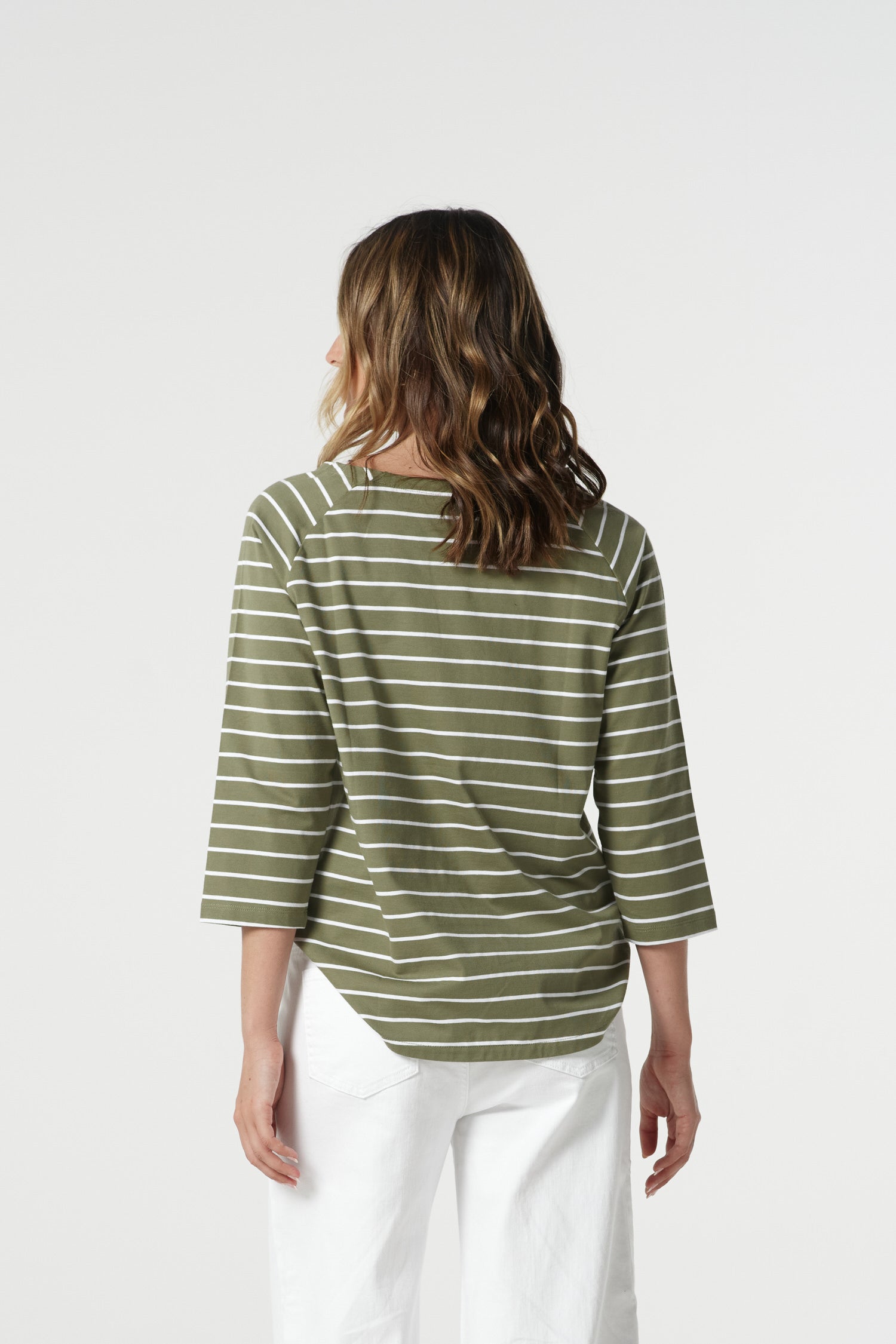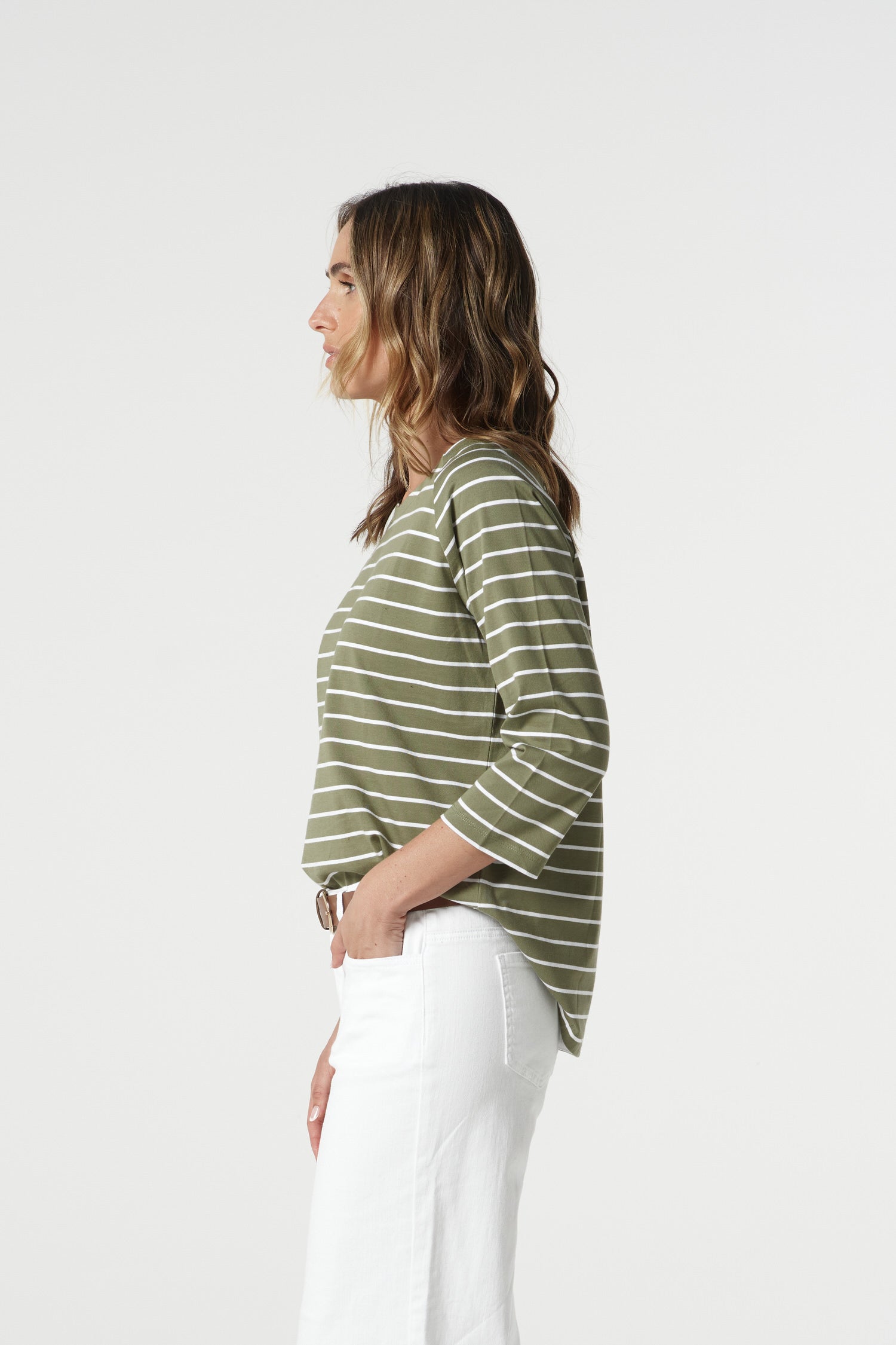 The Unwind Cotton 3/4 Sleeve Tee in Sage and white is crafted from 100% pima cotton jersey in a premium yarn-dyed stripe. With a boat neckline, raglan 3/4 sleeves, curved hem and regular fit, it’s our favourite shape for spring — light, breathable and easy to pair with denim, shorts or skirts.