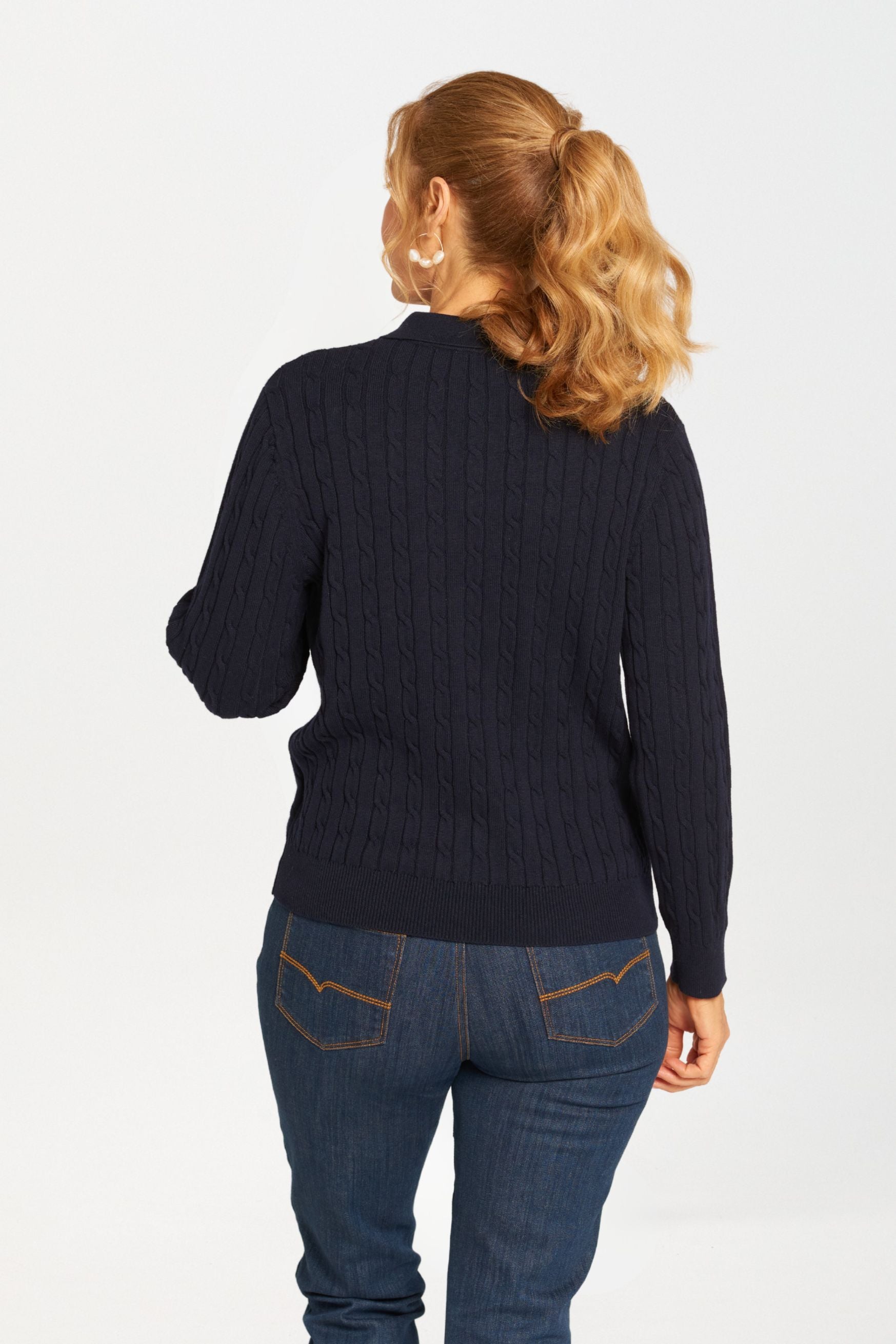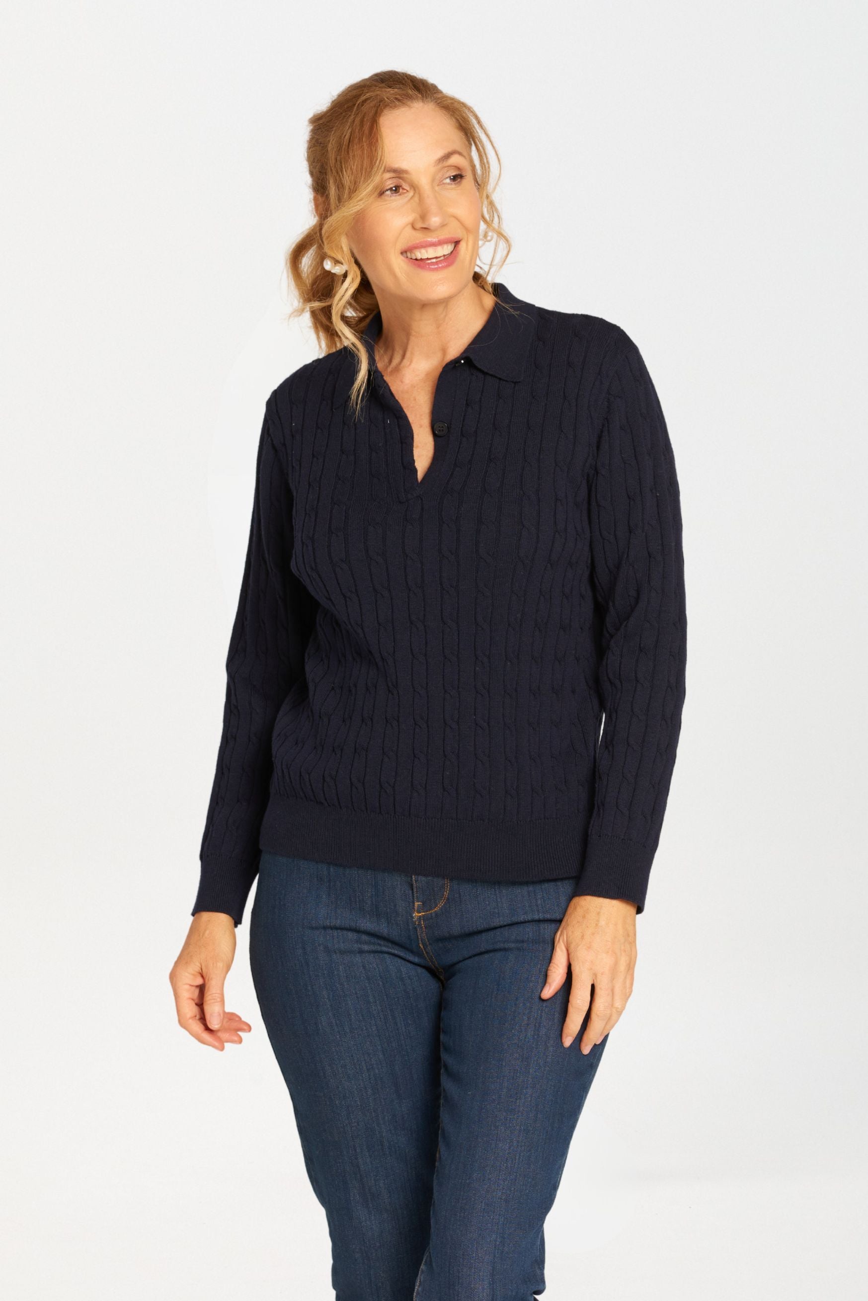 Everyday knitwear thats luxury to touch and easy to wash. Our Portia jumper is a lightweight preppy knit classic features a shirt neckline with cotton collar and cable knit embroidery.