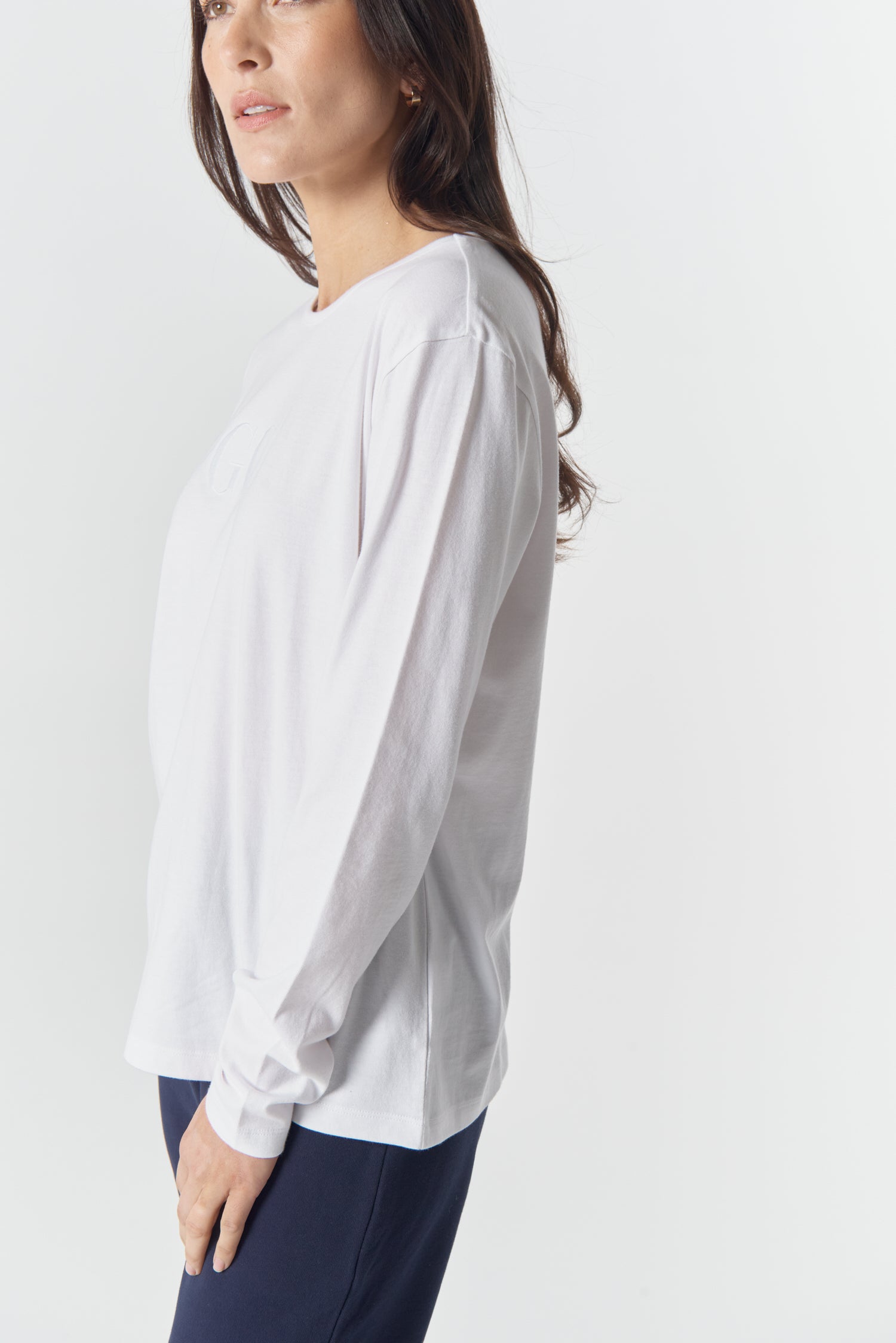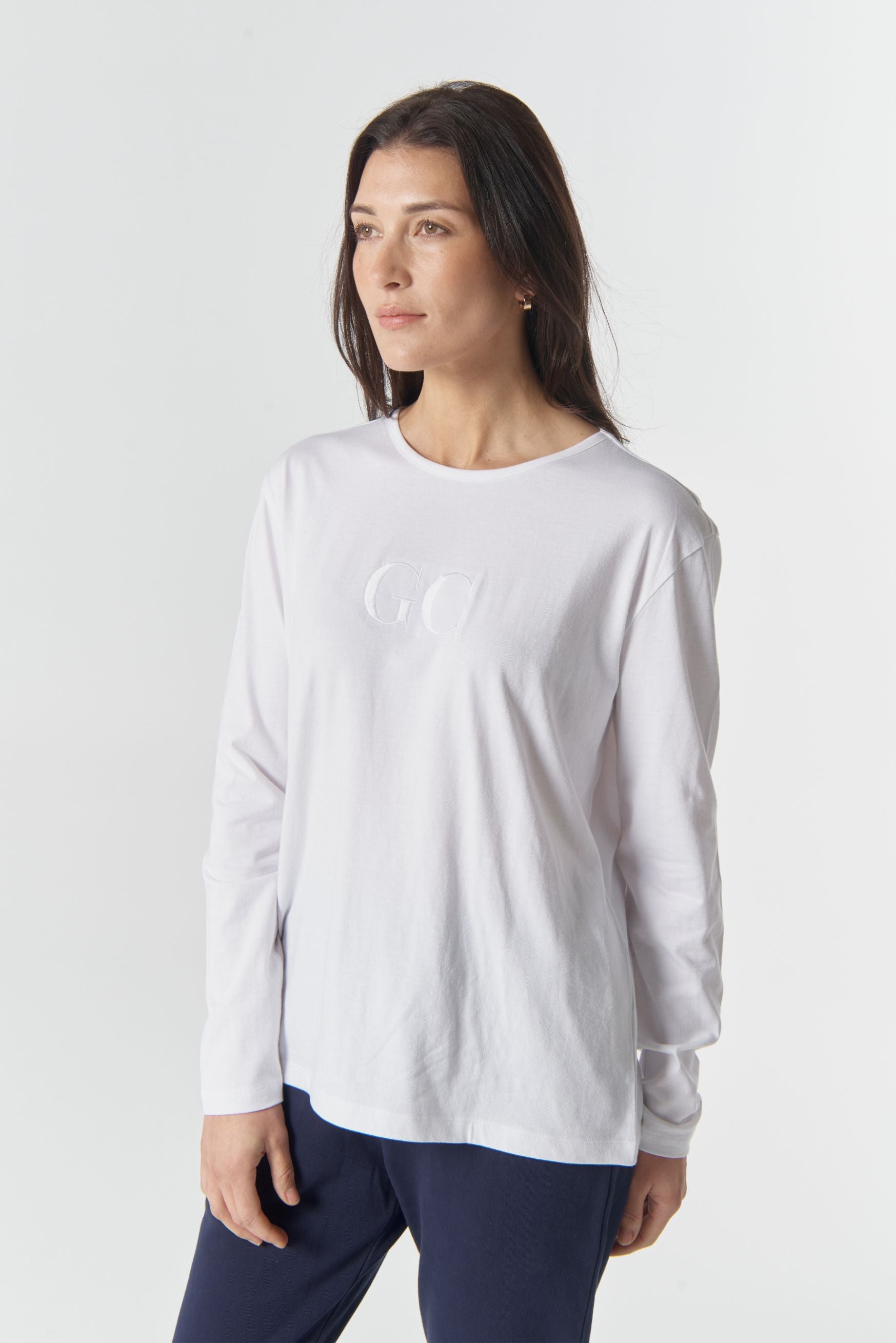 The GC Long Sleeve Jersey Tee in White is a timeless wardrobe essential crafted from 100% soft cotton for comfort you can wear all day. Featuring a classic crew neckline, long sleeves and a regular fit with clean, straight hem, this versatile tee pairs effortlessly with jeans, skirts or layering pieces for cooler days. Finished with subtle GC chest embroidery, it’s a quality staple that combines everyday style with everyday ease.