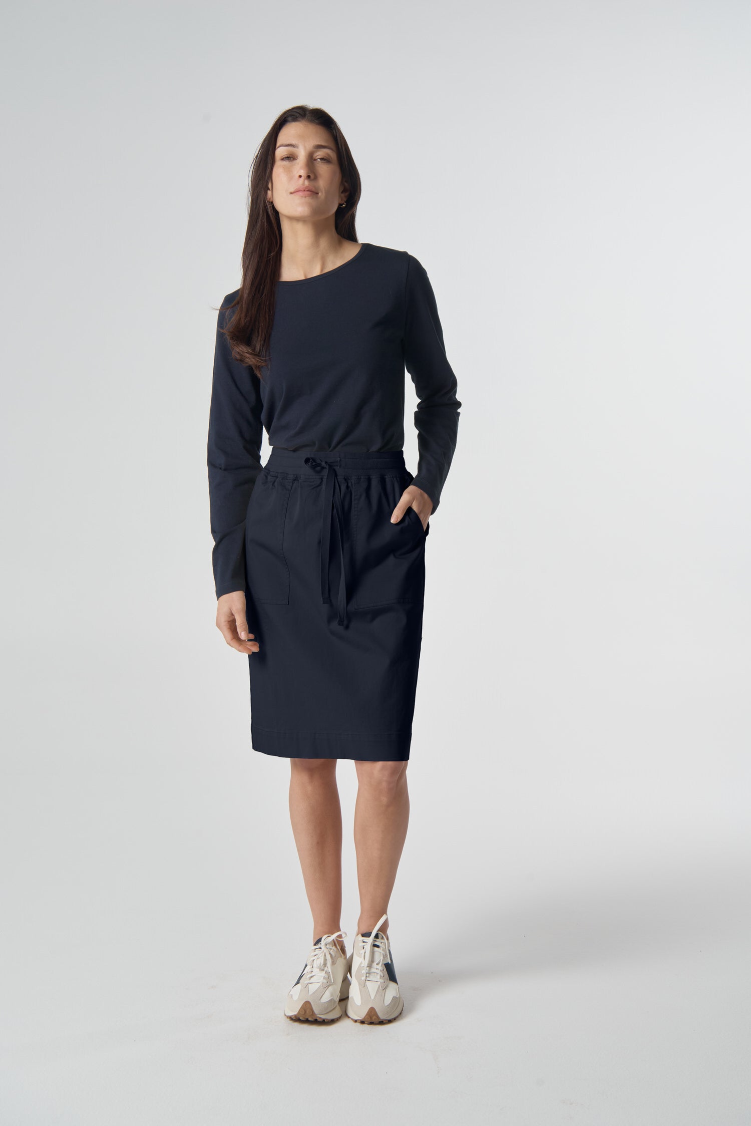 The Weekend Knee Length Stretch Cotton Skirt in dark navy is crafted from a cotton elastane blend for comfort with a touch of stretch. Featuring a rib knit waistband with dyed-to-match drawcord, front patch pockets, side splits and a knee length, it’s an easy pull-on style made for relaxed, everyday wear.