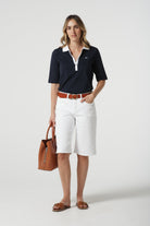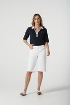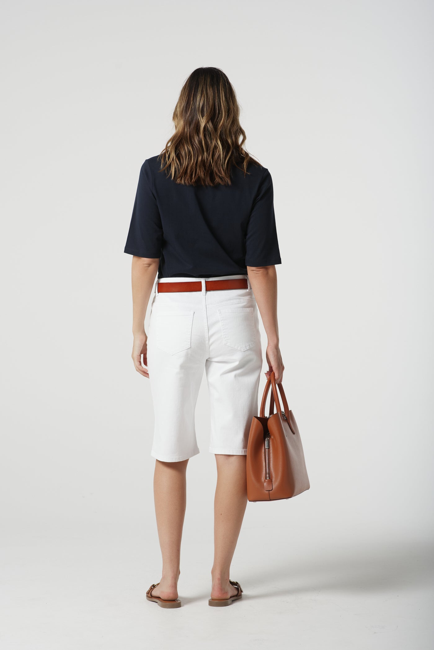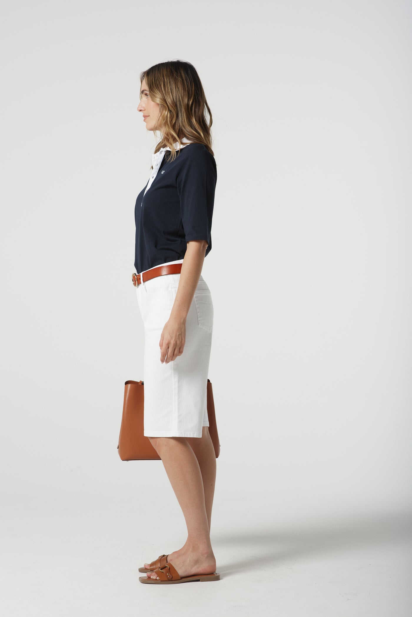 Our 5 Pocket Denim Shorts in white are made from our signature cotton denim with a touch of stretch for comfort. With a classic five-pocket design and a flattering knee-length cut, they’re a fresh, versatile staple for warm days, pairing effortlessly with tees, shirts or blouses.