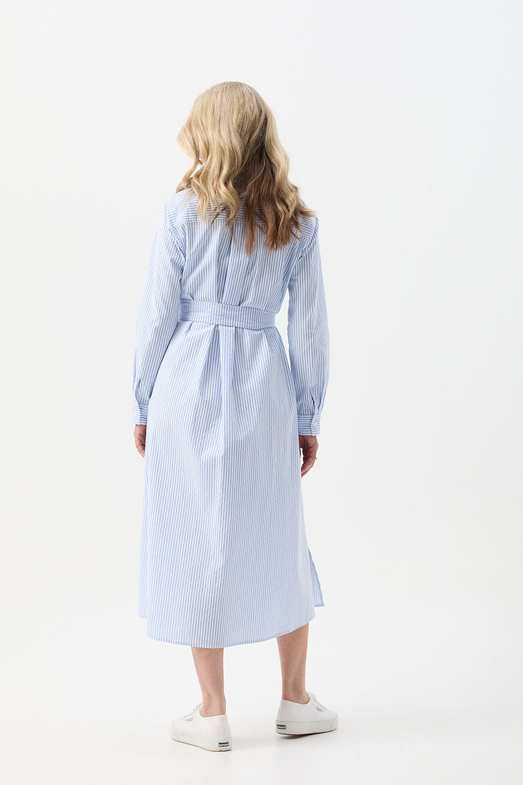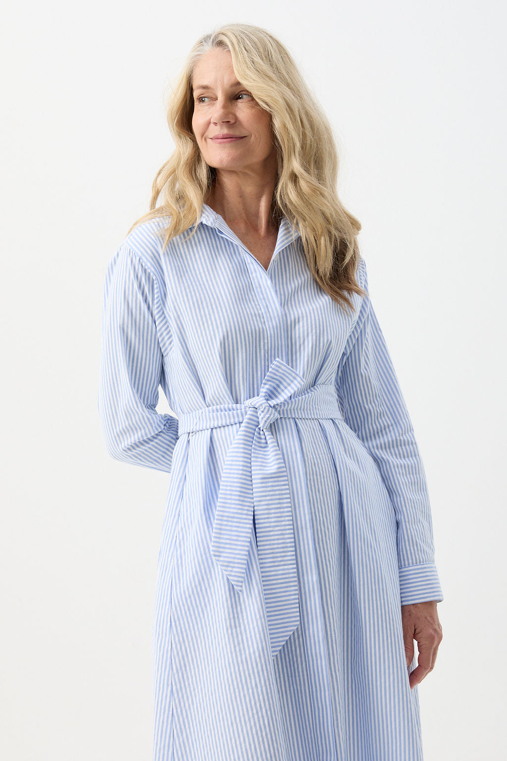 Good quality cotton but I should have ordered a Size 16 as the arms too big and length of drees rather long. I altered the sleeves under armpits, took up the hem and lengthened the side slits. Added the left-over striped, blue material to finish off the look of beltloops. The threaded cotton string was difficult to see and was flimsy.