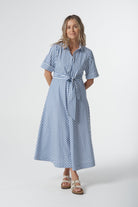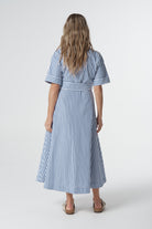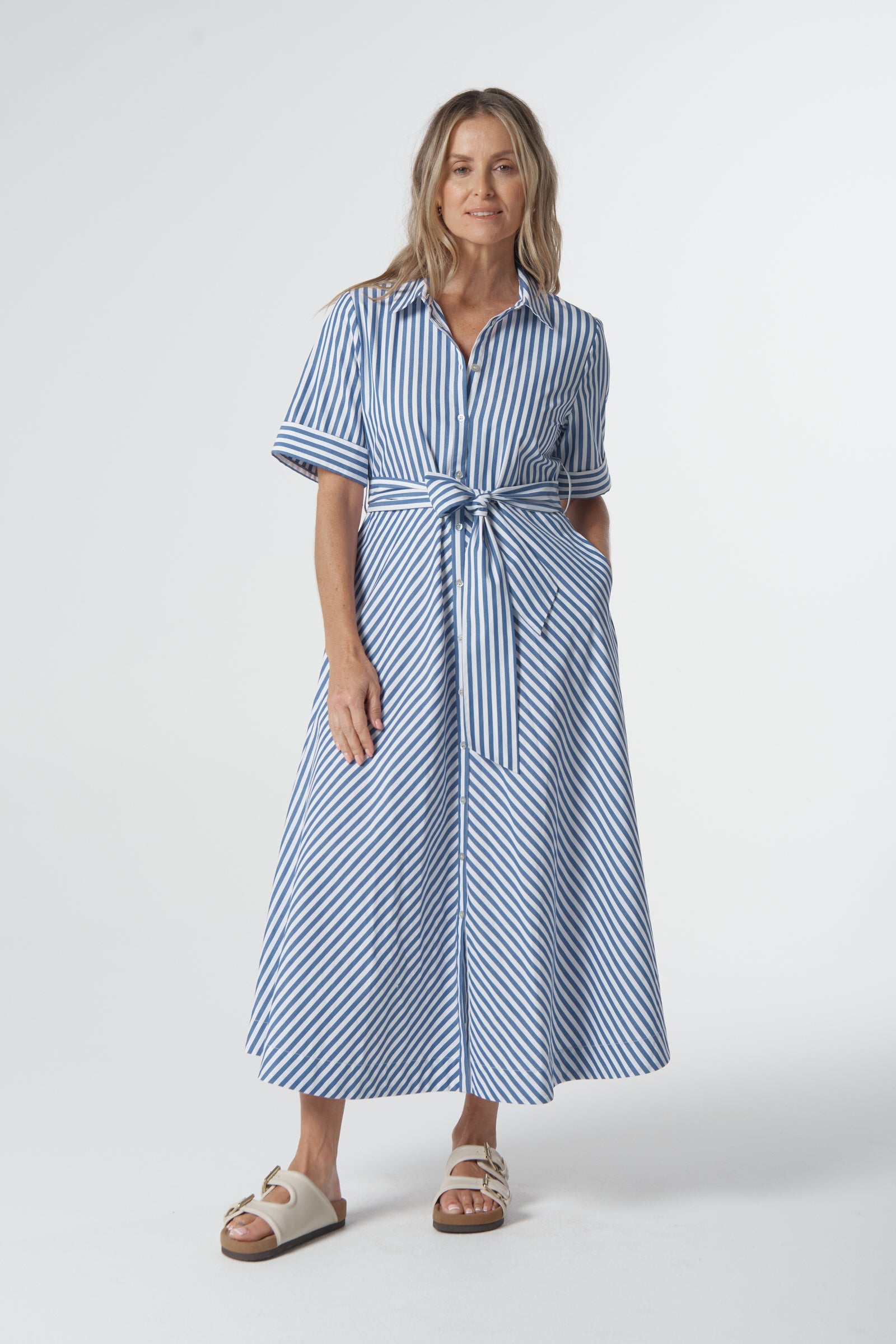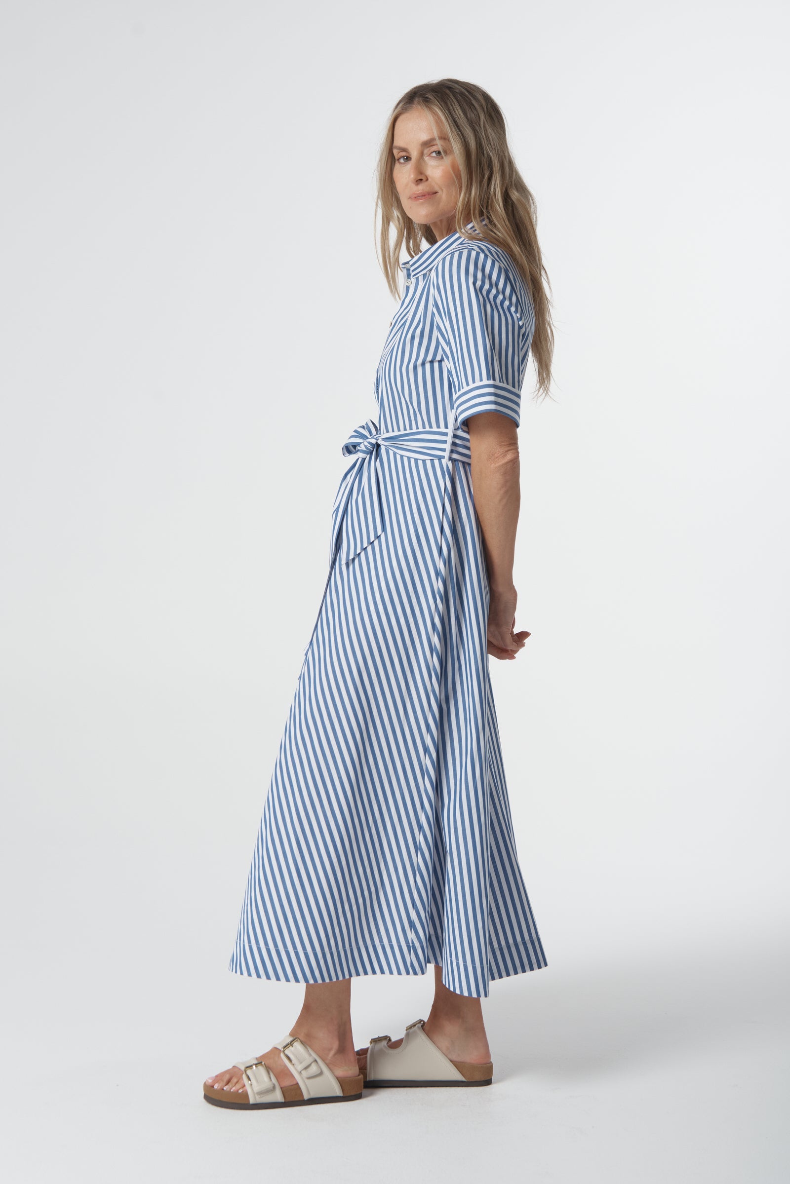 Our classic bias-cut cotton dress in a blue and white yarn-dyed stripe offers a timeless look with a flattering, feminine drape. Crafted from 100% breathable cotton, the bias cut moves beautifully with the body, making it an effortless choice for warm days and laid-back occasions.