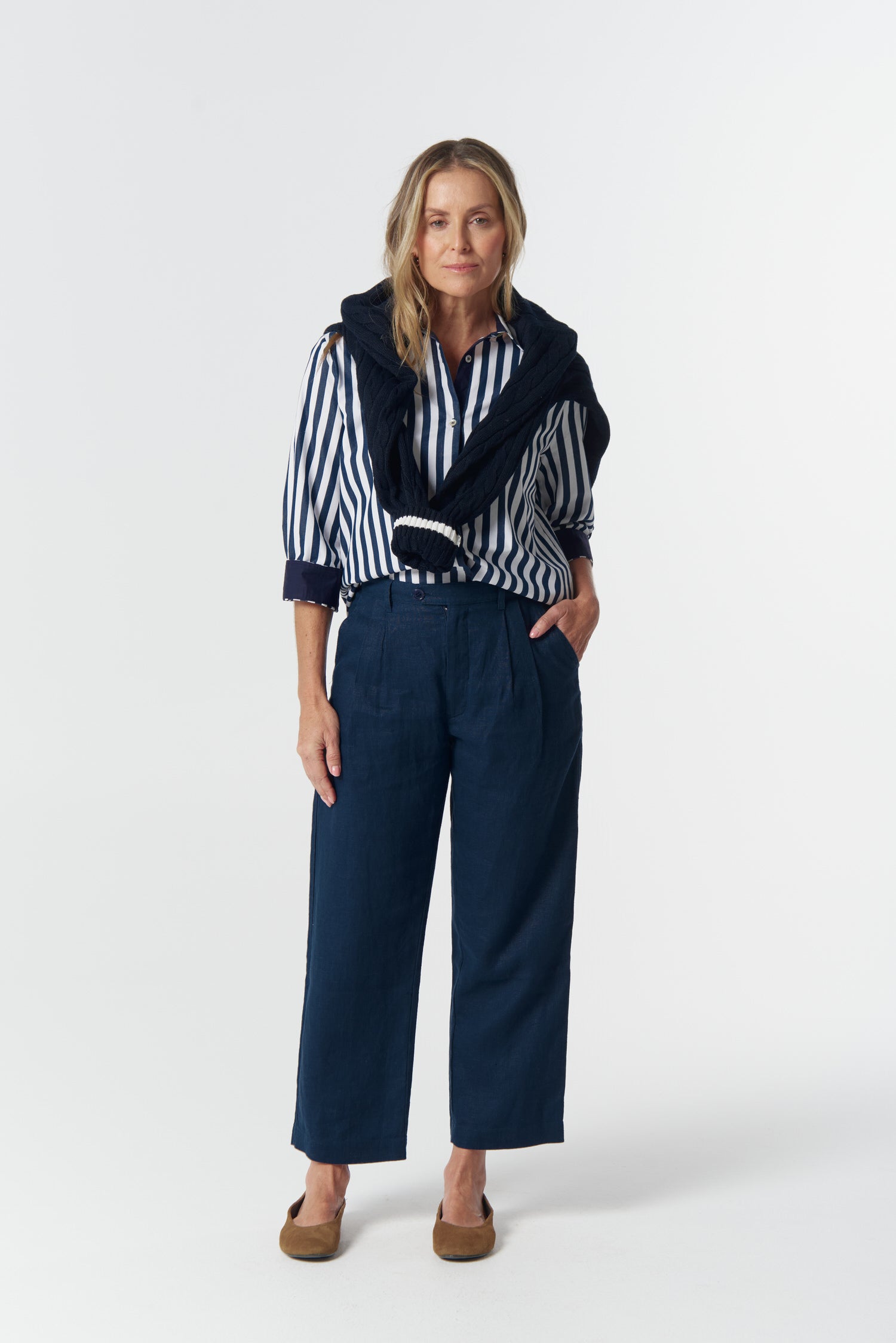 The Classic Cotton ¾ Sleeve Shirt in Dark Navy/White is a timeless wardrobe essential crafted from breathable, quality cotton. Featuring a semi fitted silhouette with a classic collar, button-through front and flattering ¾ sleeves, it pairs effortless style with everyday comfort. Finished in smart navy and white stripes, this versatile shirt layers beautifully with denim, skirts or pants — perfect for relaxed weekends or elevated casual looks.