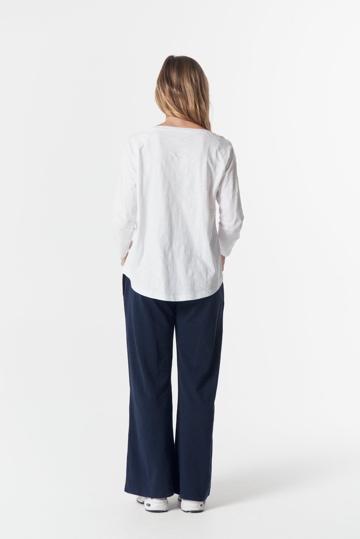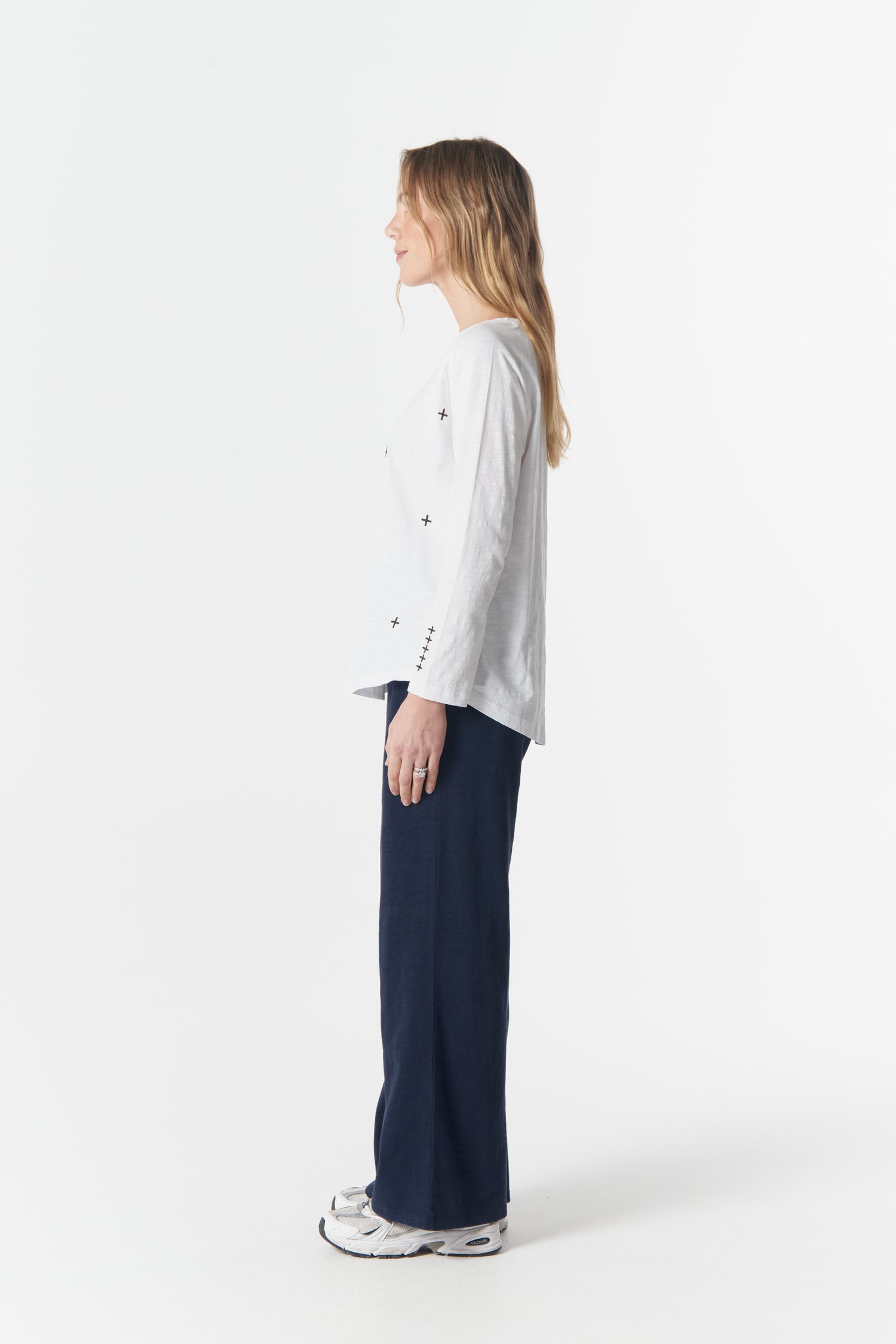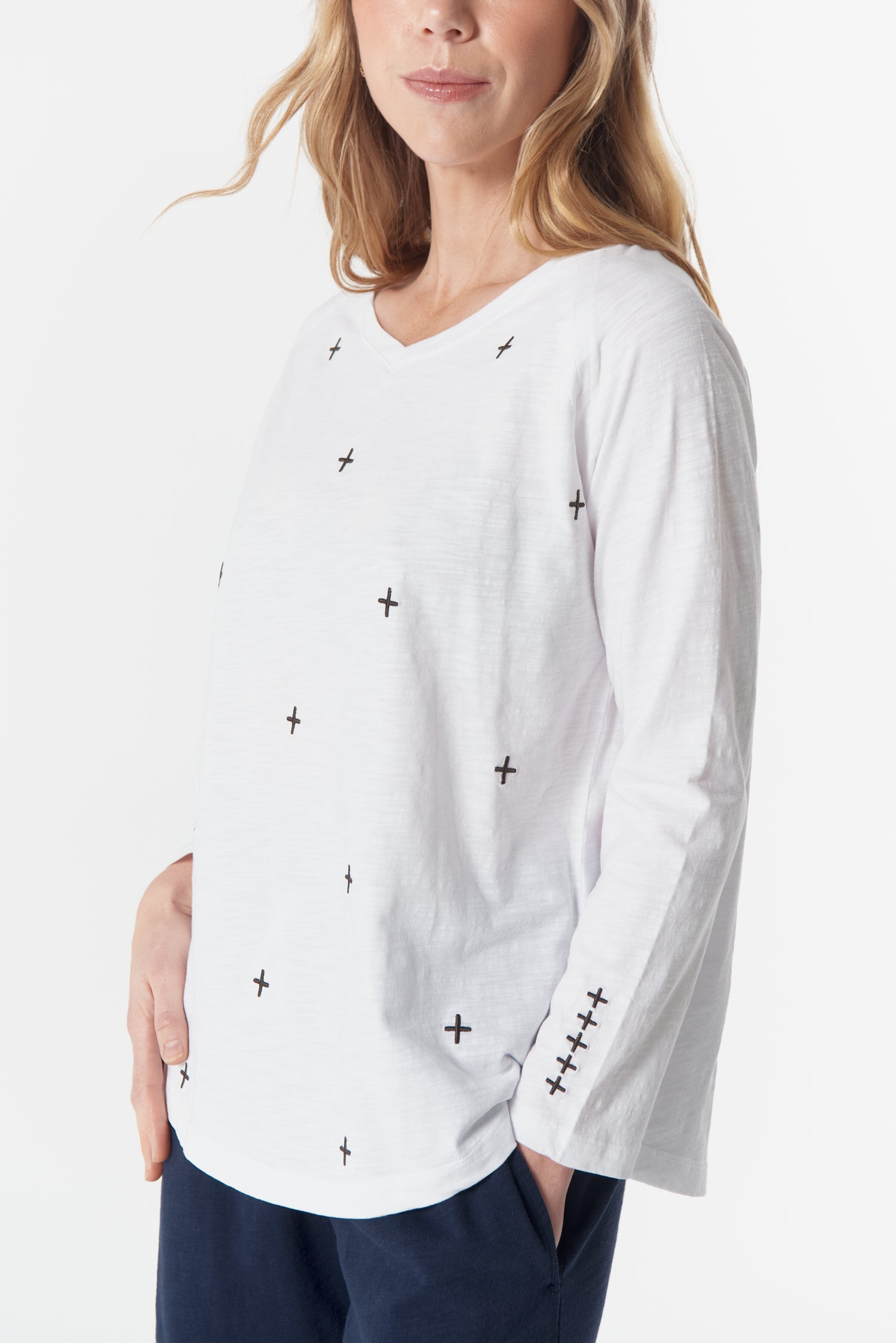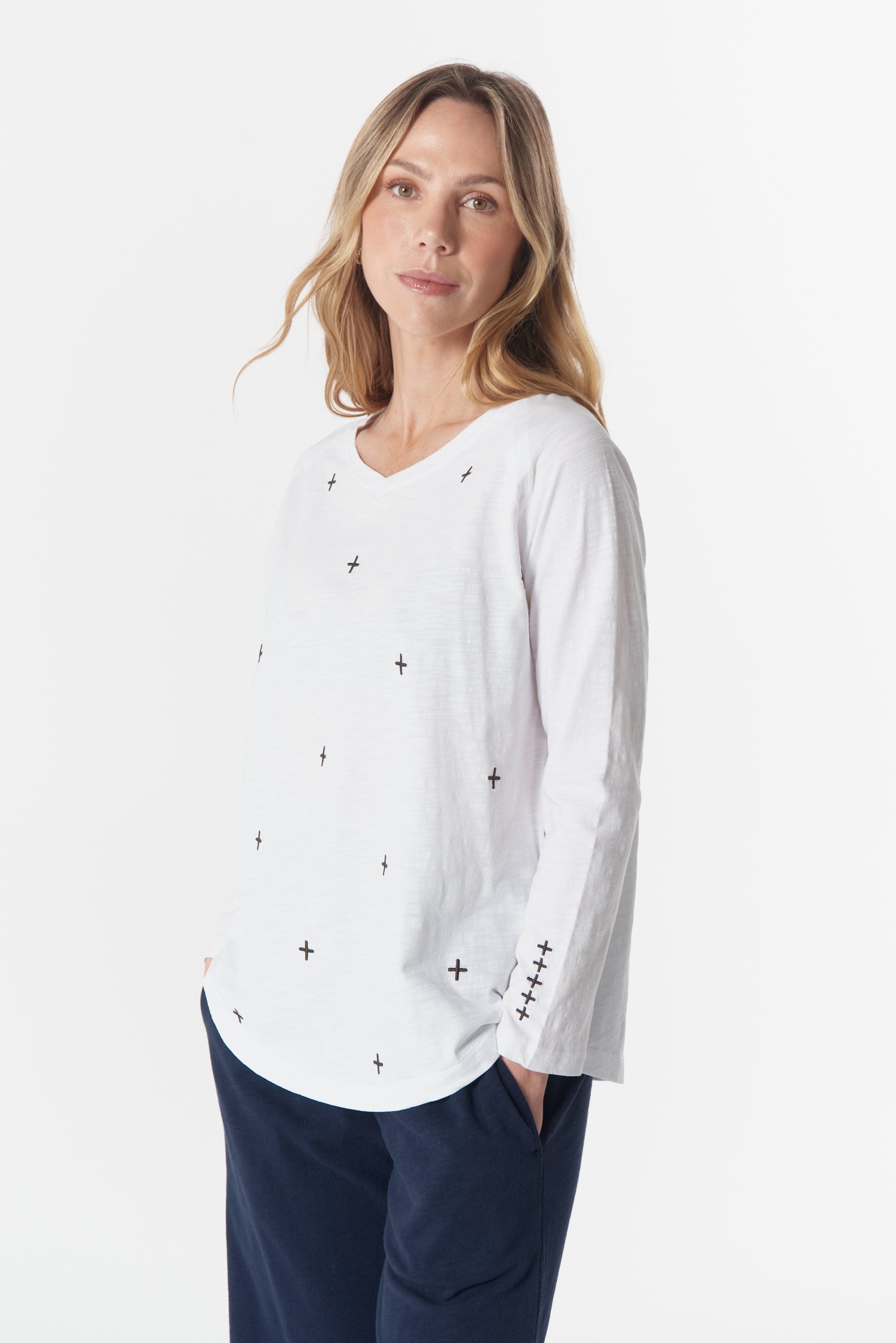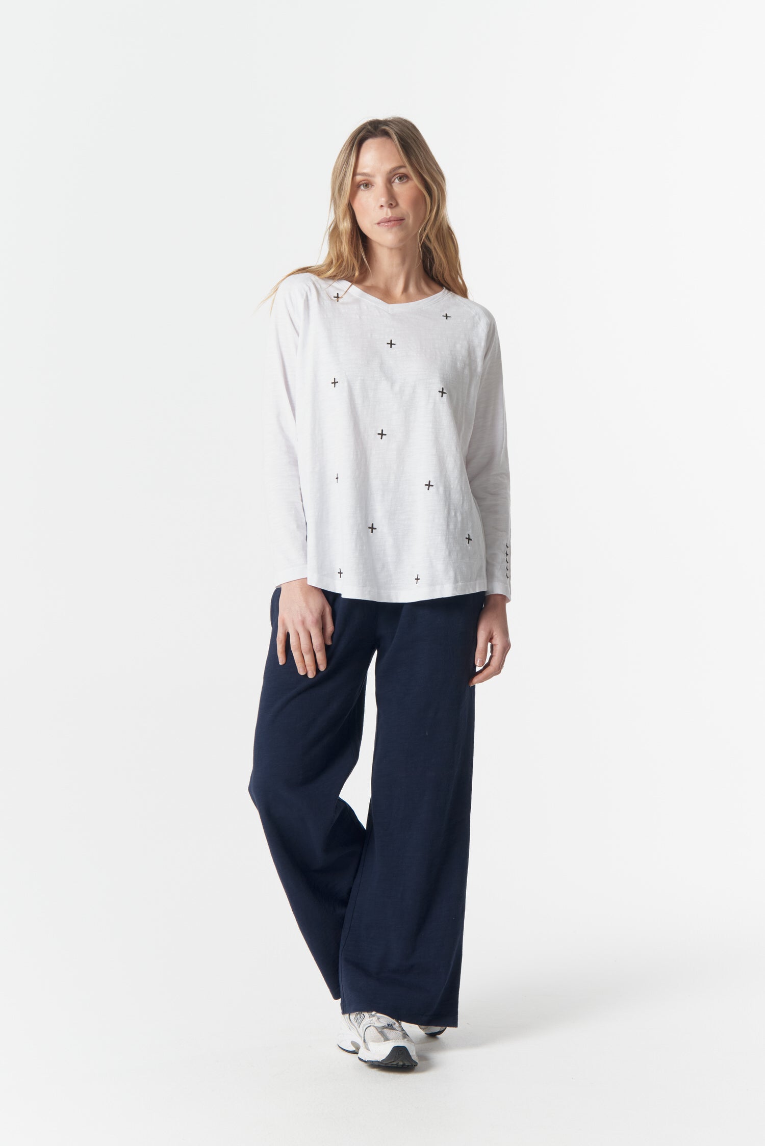 A clean long sleeve with a signature cross embroidery. Relaxed, soft, and ready for anything.