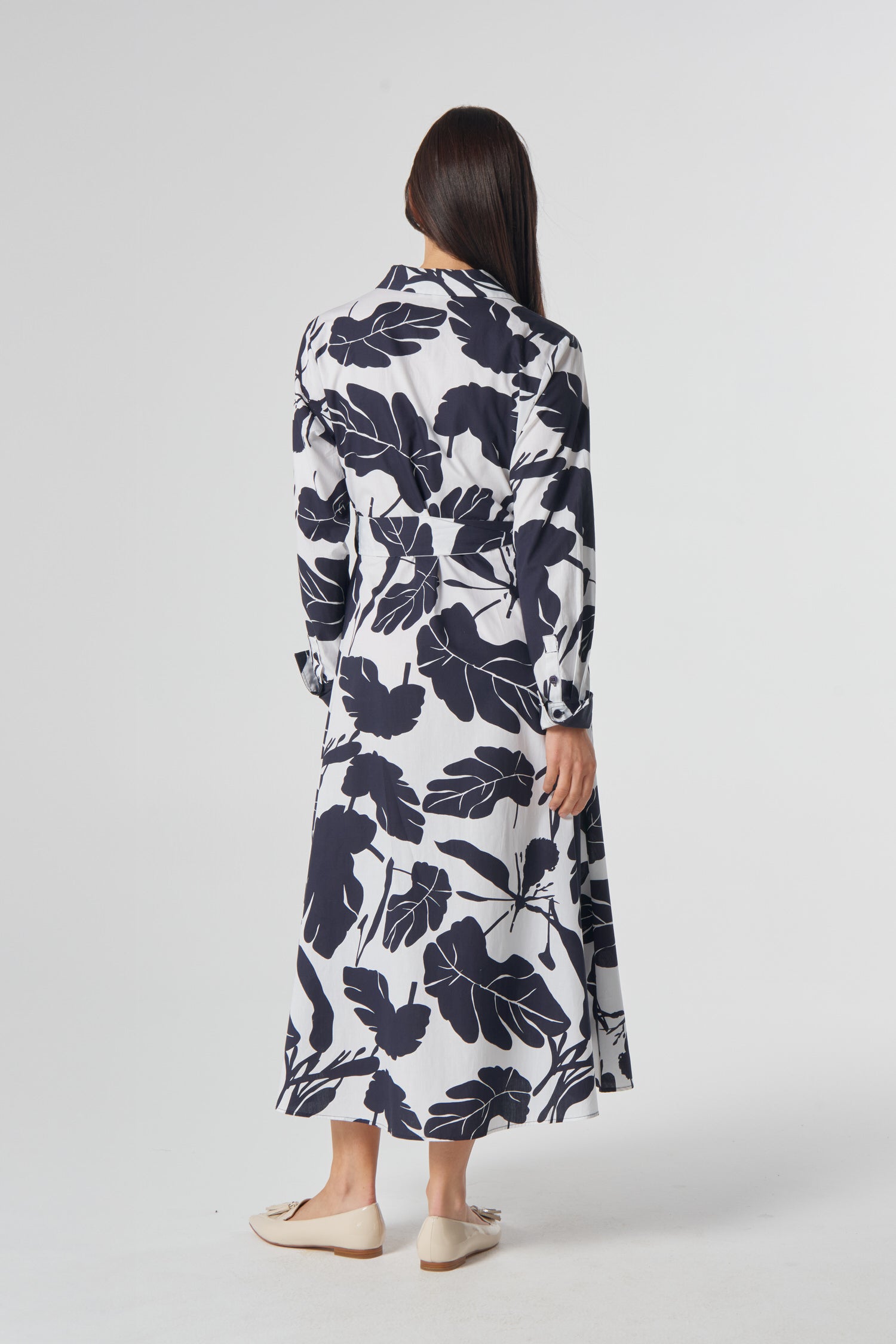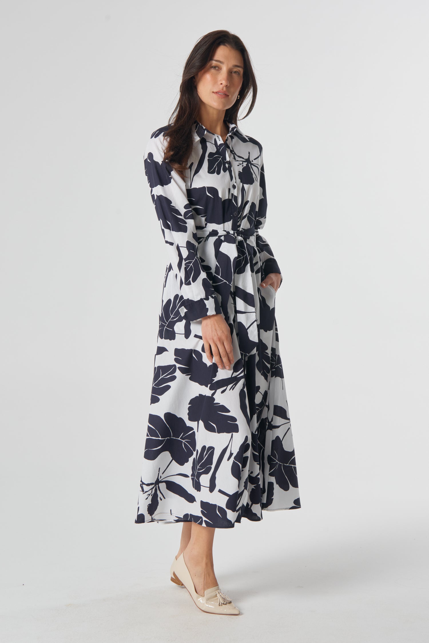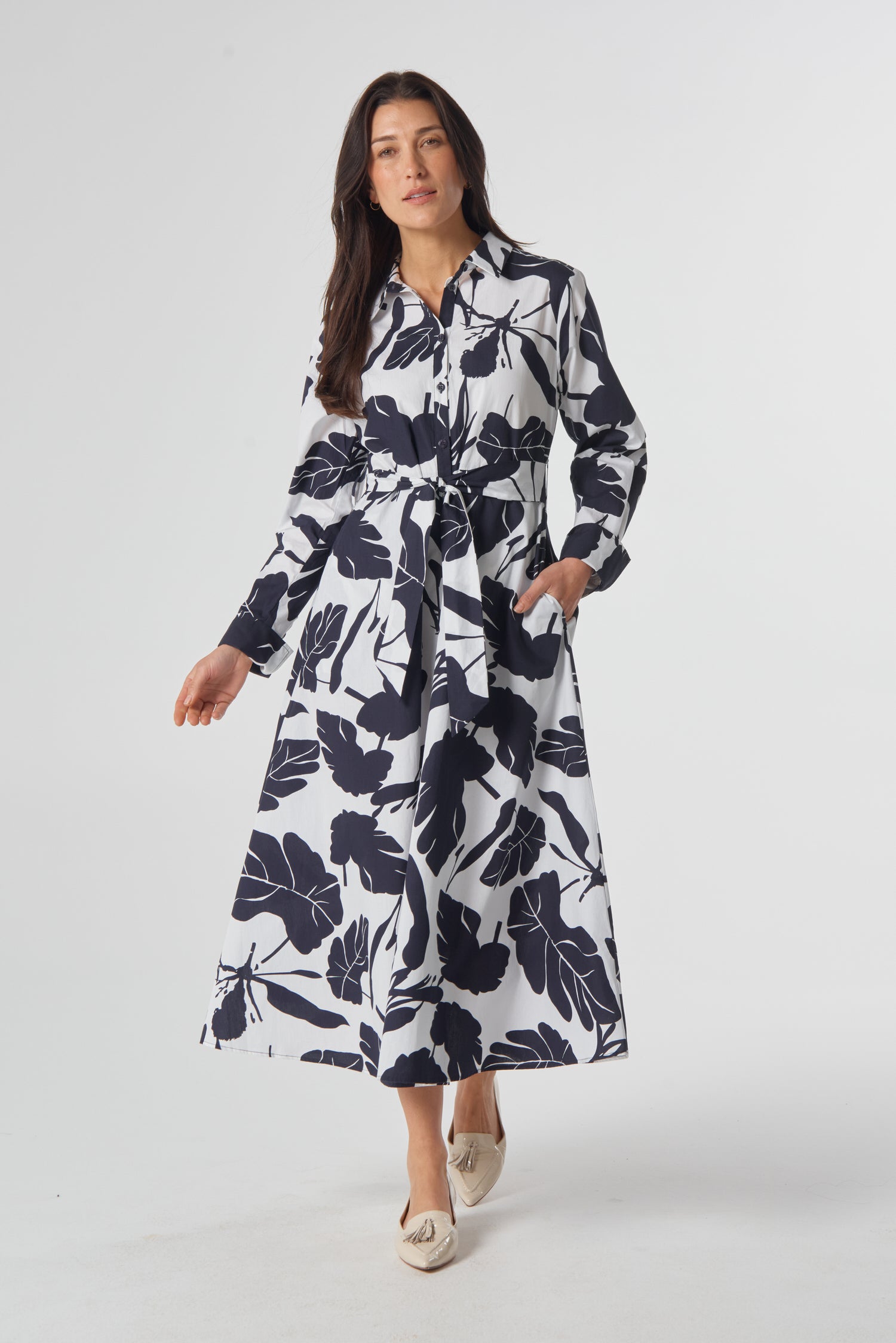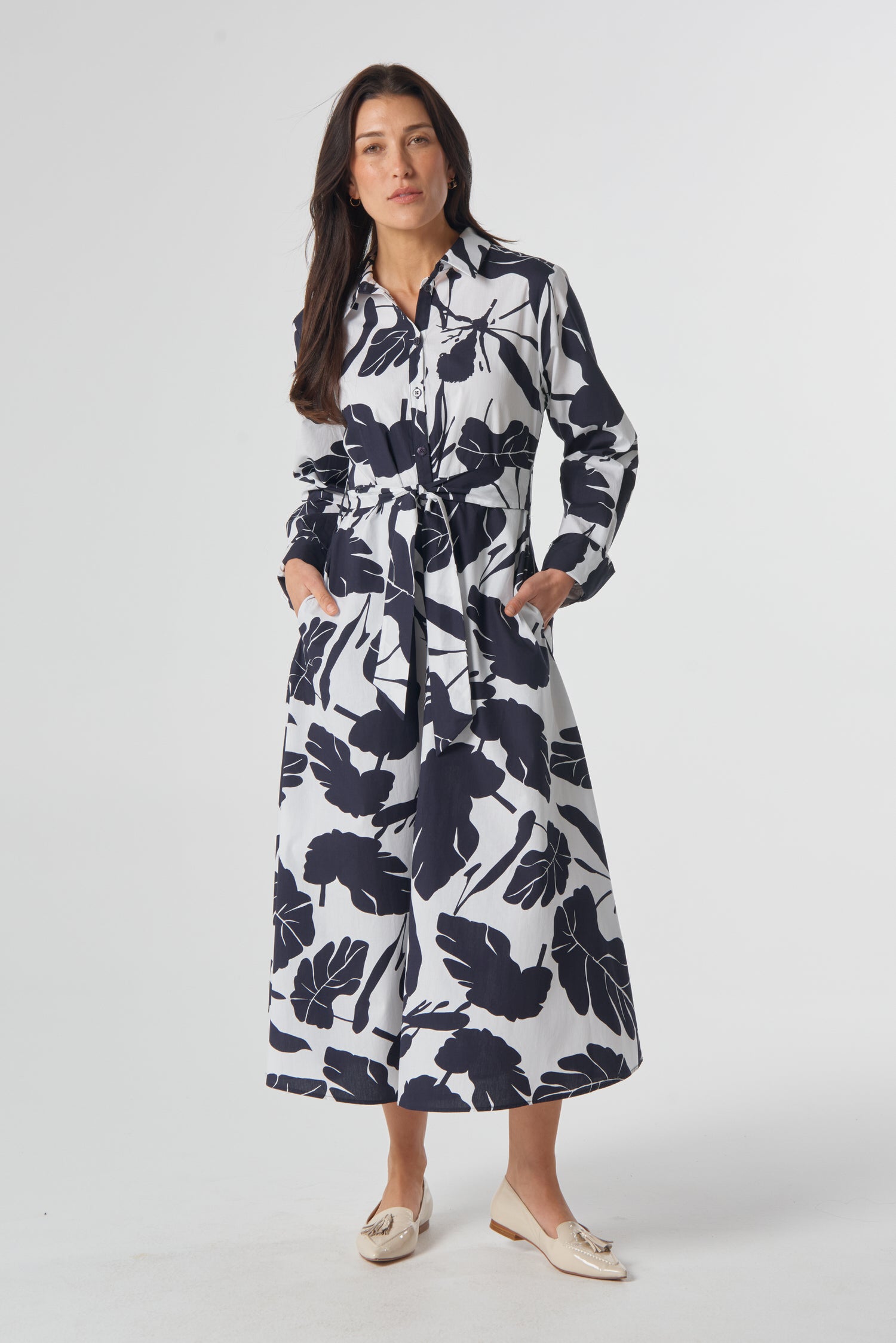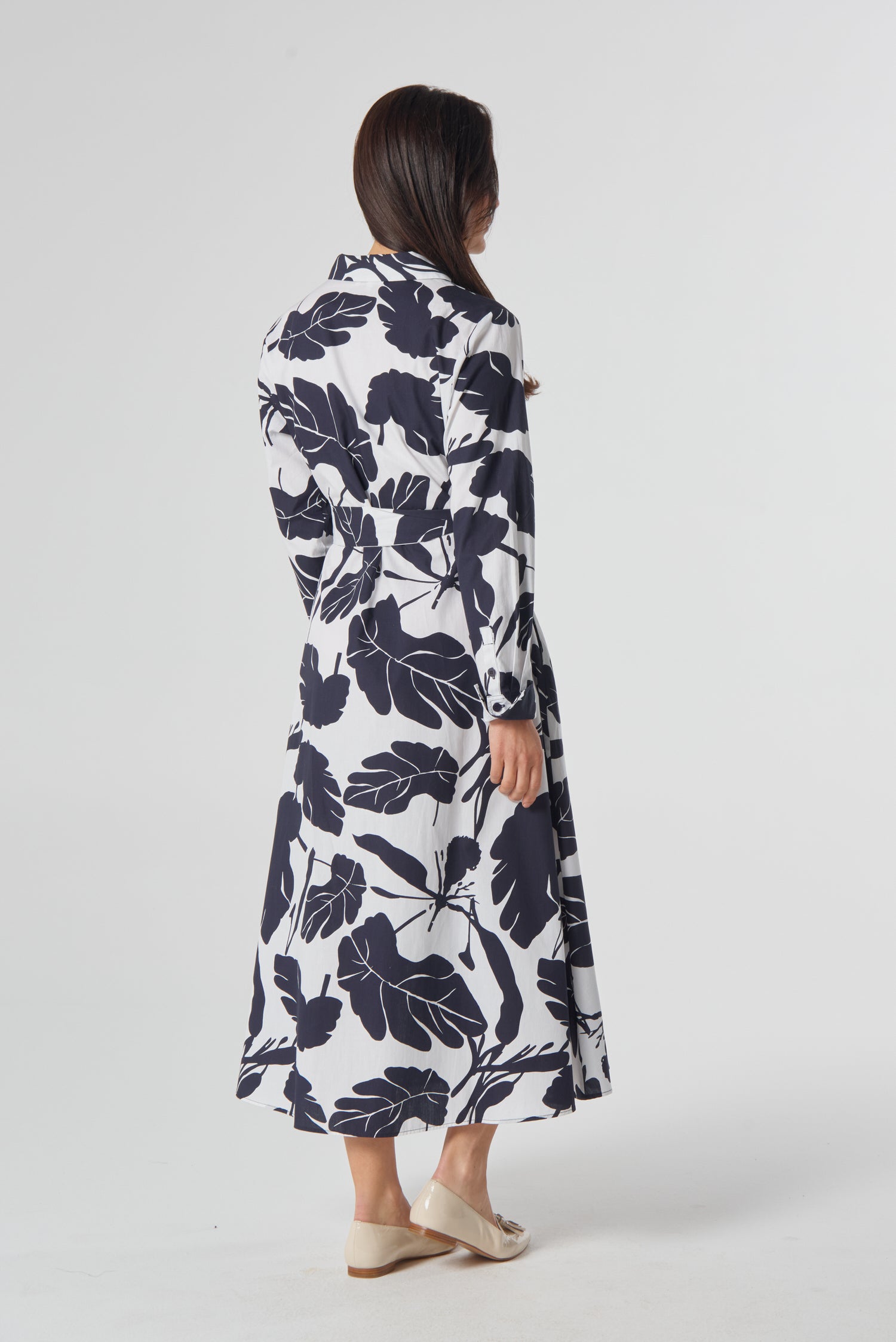 Cotton A-Line Long Sleeve Belted Dress - Block Leaf
