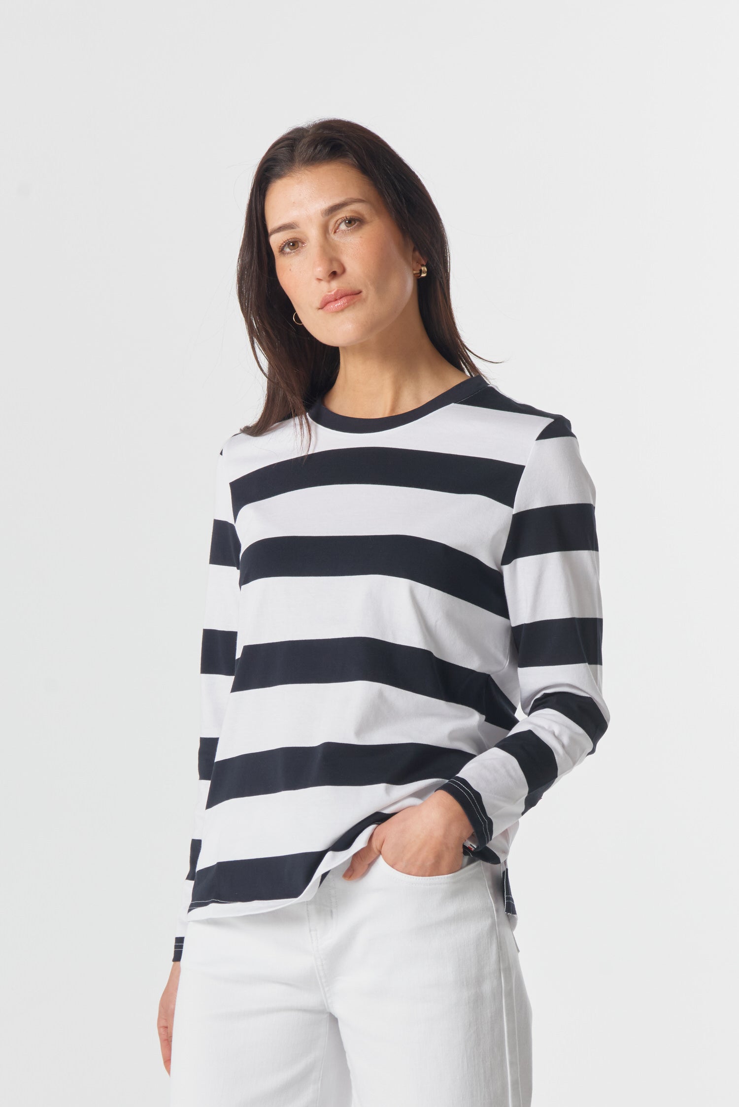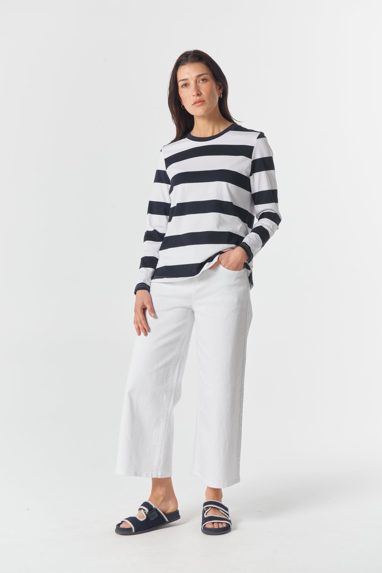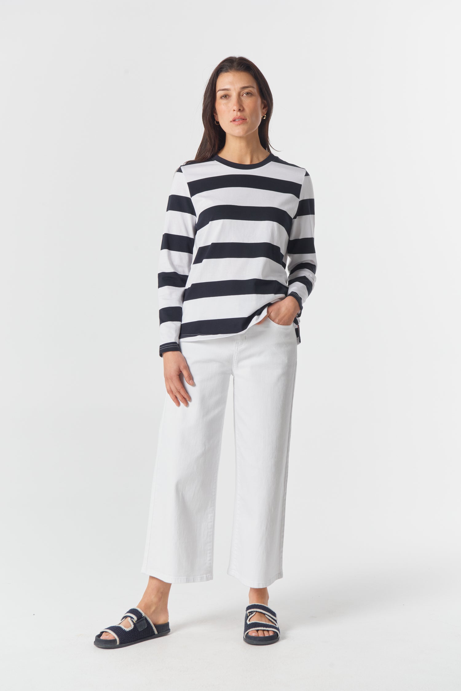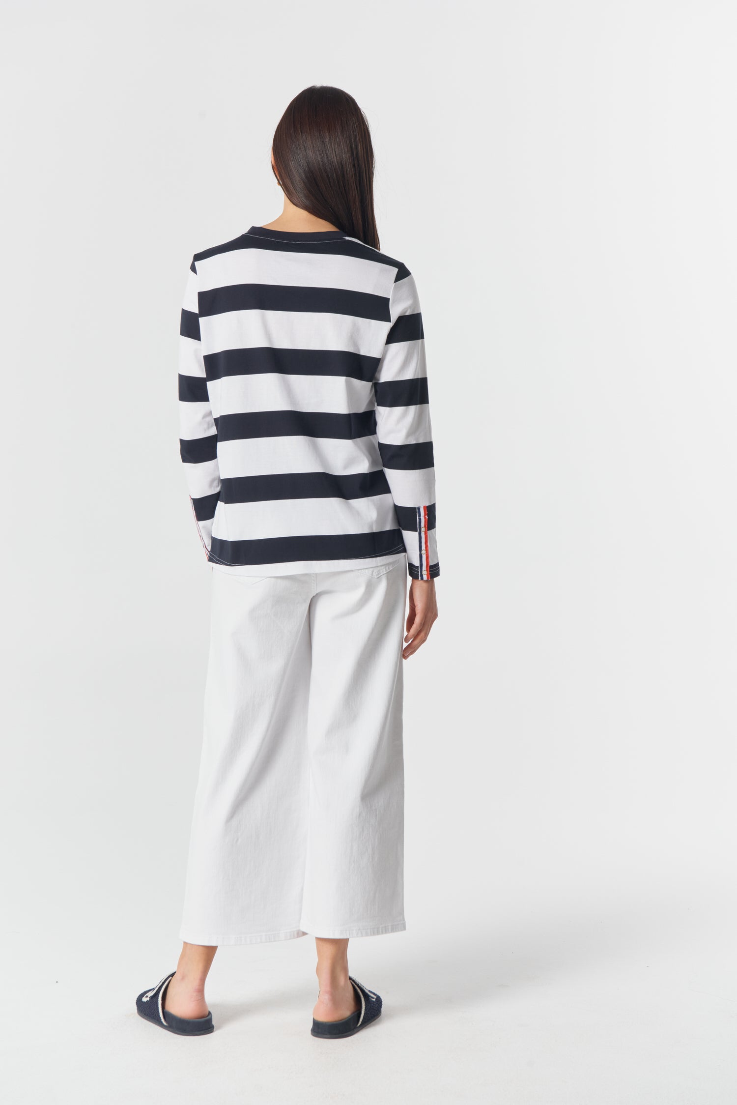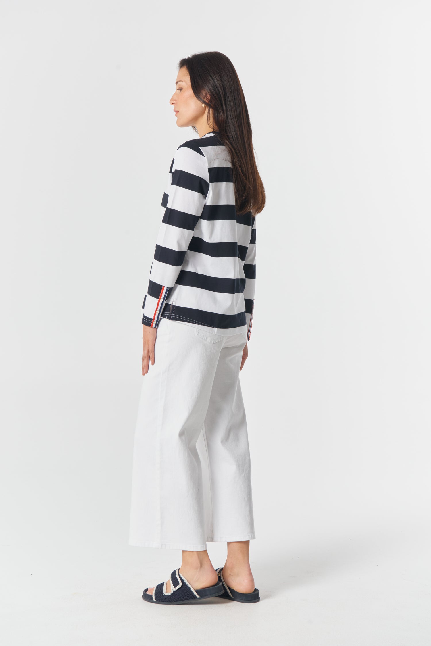 Cotton L/S Tee With Button Sleeve - White/Navy