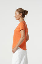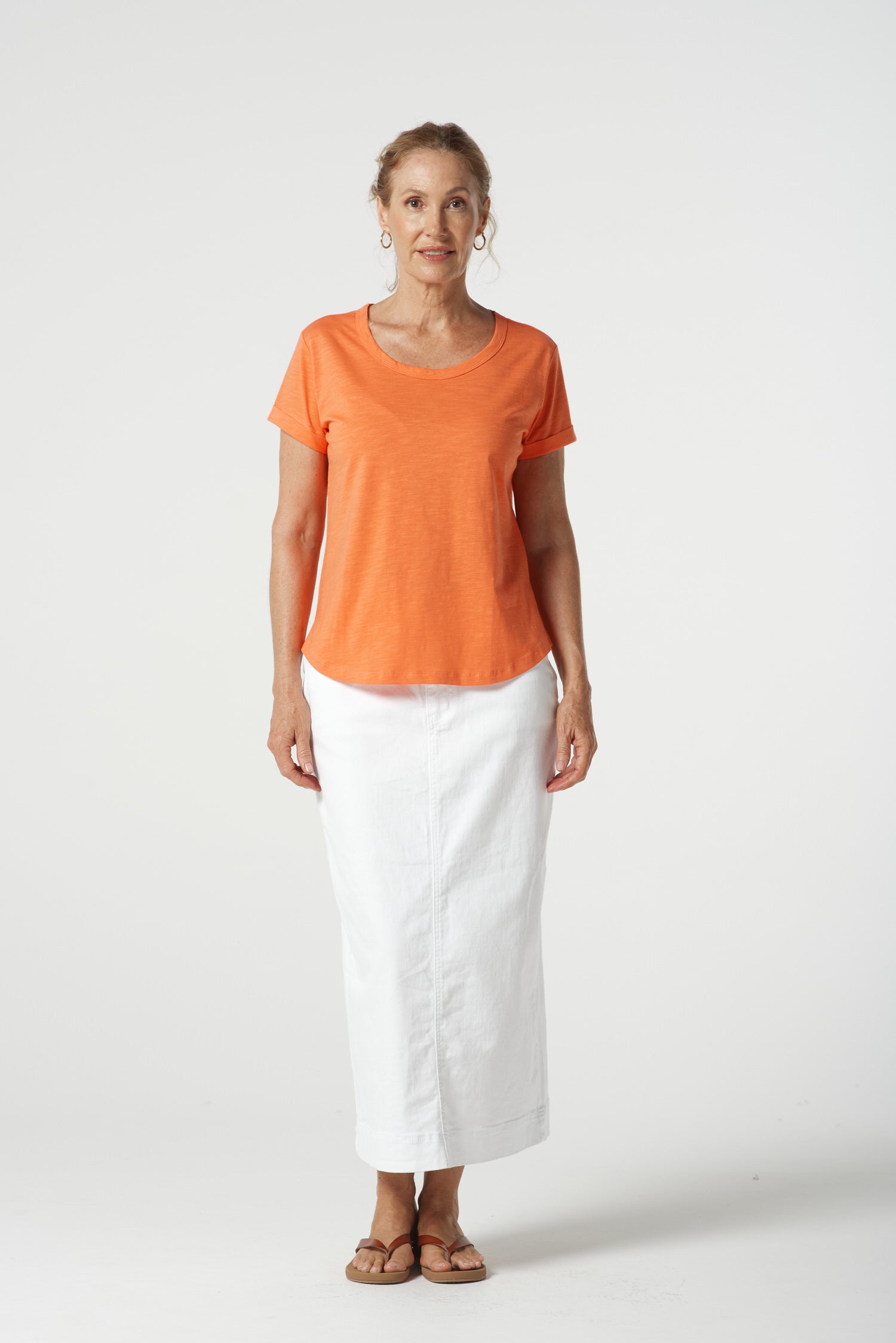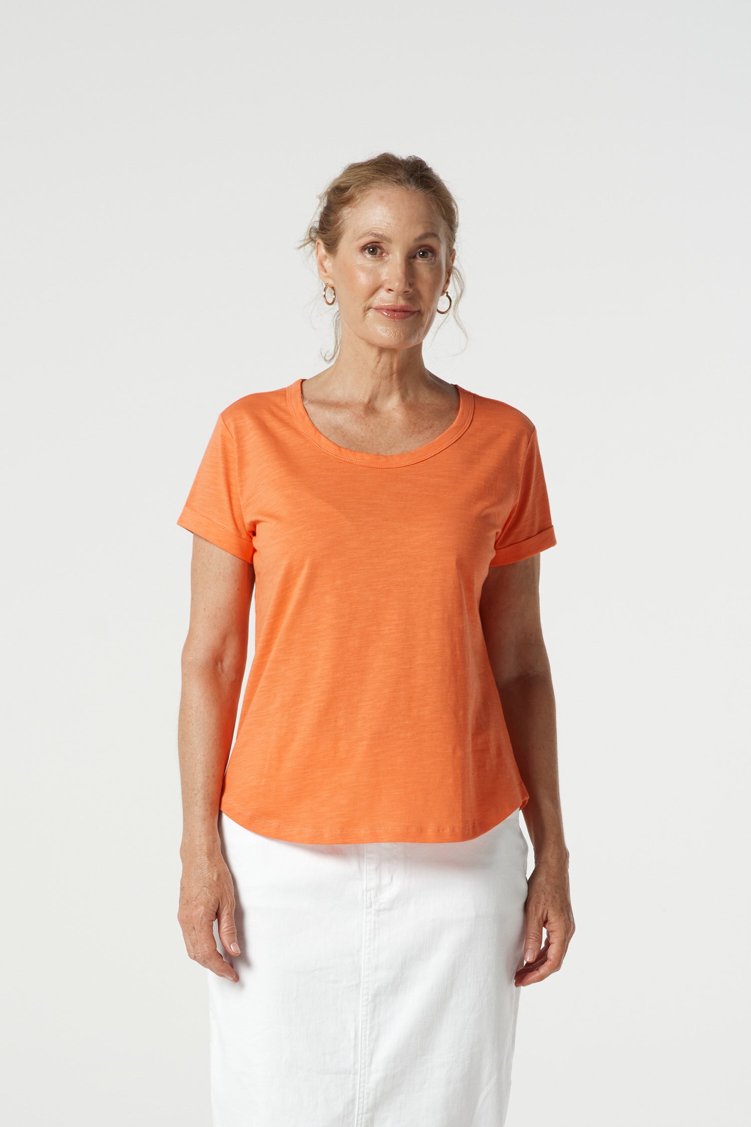 The Everyday Cotton Roll Cuff Tee in Sunset is crafted from 100% pima cotton jersey for a soft, premium feel. With a wide round neckline, curved hem and rolled sleeve cuffs, it’s an easy everyday staple that works perfectly with denim, shorts or skirts.