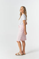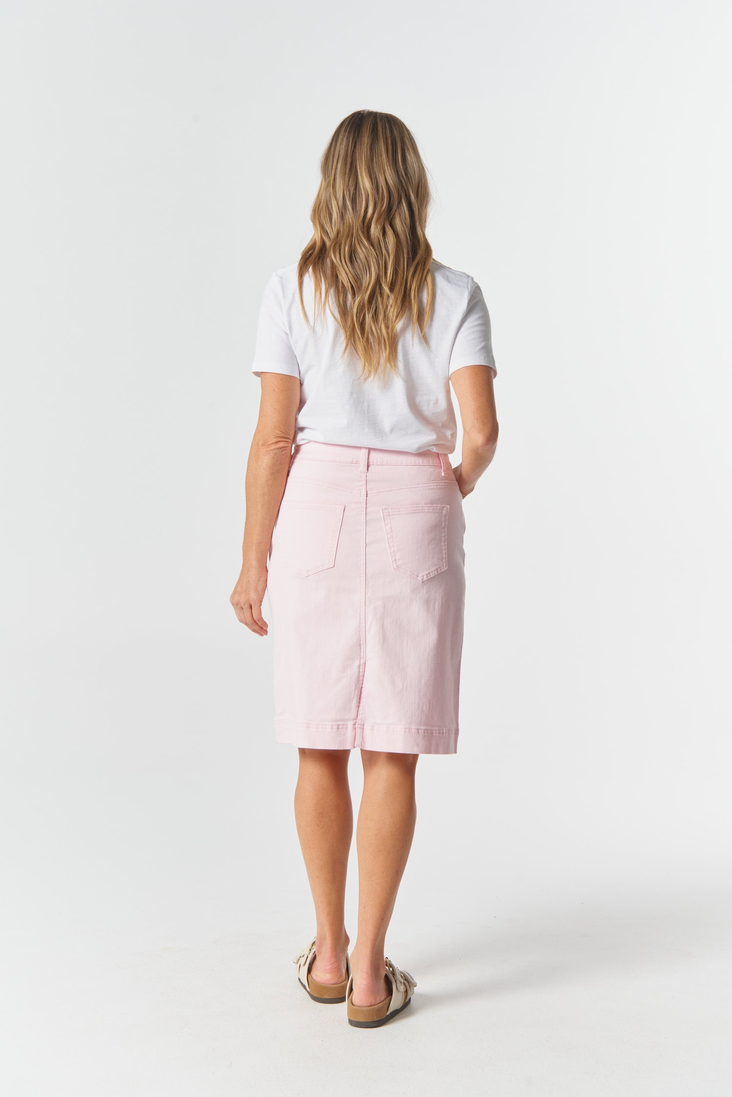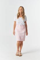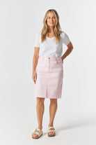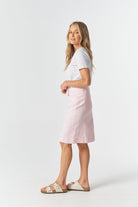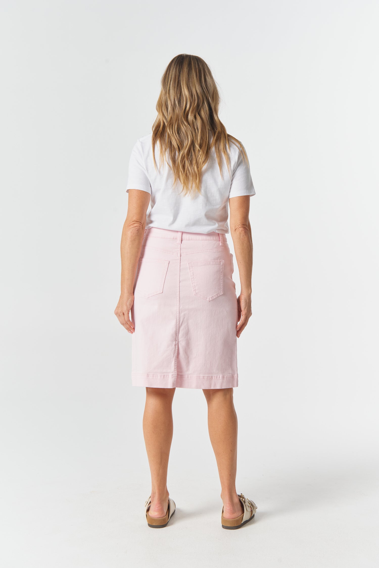 Our Knee Length Skirt in pale pink is made from our signature cotton fabric with a touch of stretch for comfort and ease. With its flattering straight cut and classic knee-length finish, it’s a versatile piece that pairs beautifully with shirts, blouses or relaxed knits.