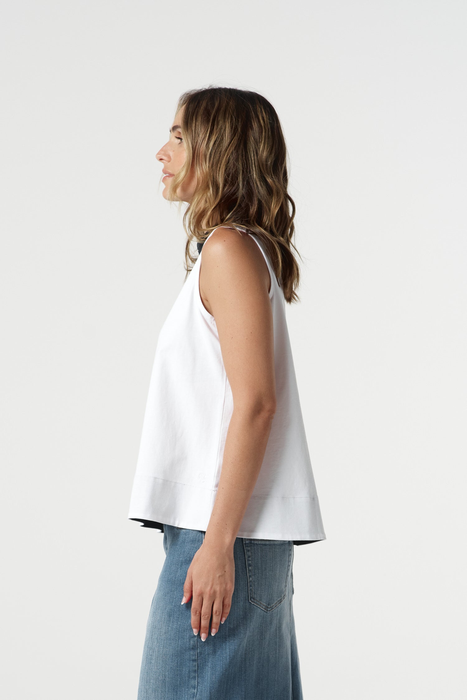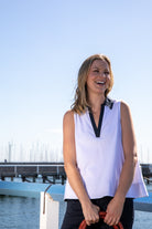 The Reef Cotton Contrast Sleeveless Polo in white is made from 100% pima cotton jersey for a soft, premium feel. Designed in a modern A-line fit with a contrast placket, curved hem and feature contrast hem facing, it’s finished with the GC logo for a timeless touch — an effortless sleeveless style for warm summer days.