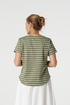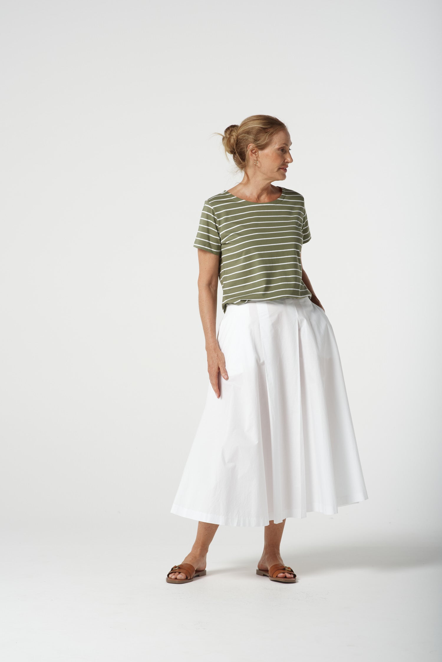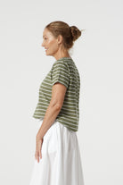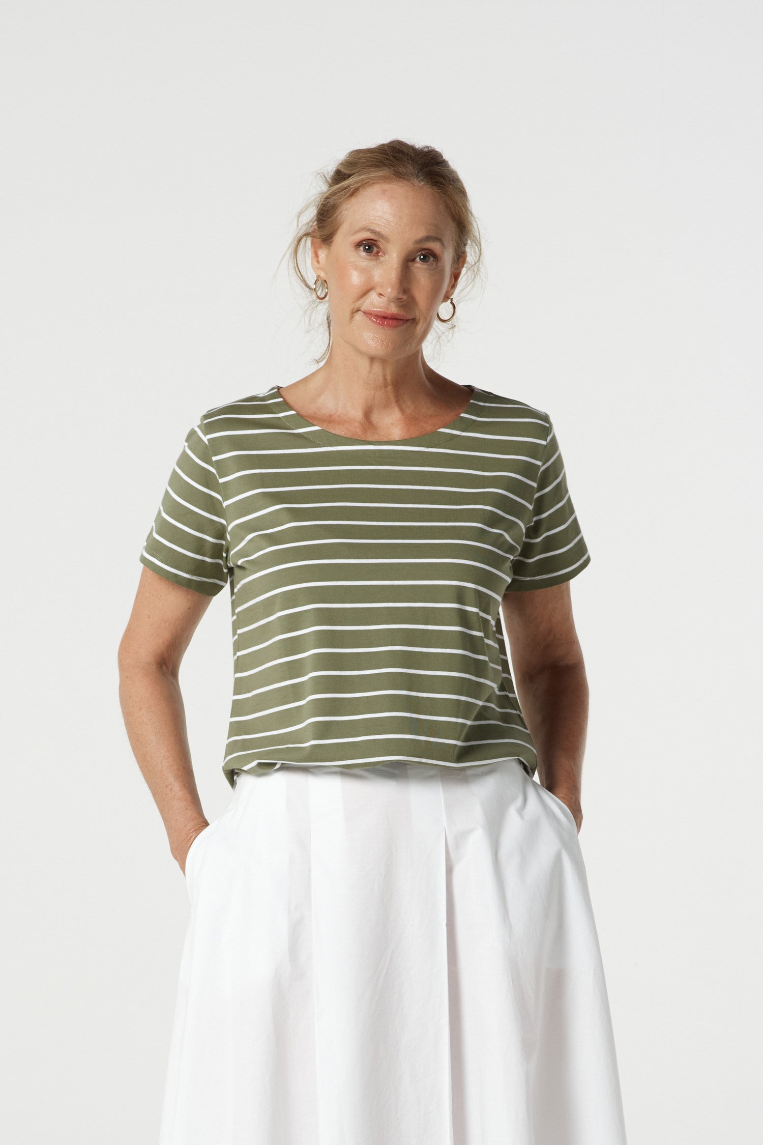 The Relax Cotton Tee in Sage is crafted from 100% pima cotton jersey in a premium yarn-dyed stripe for softness and breathability. The perfect basic tee reimagined in modern colours, it features a boat neckline with contrast facing, a curved hem and contrast hem detail, making it an easy go-to with denim, shorts or skirts.