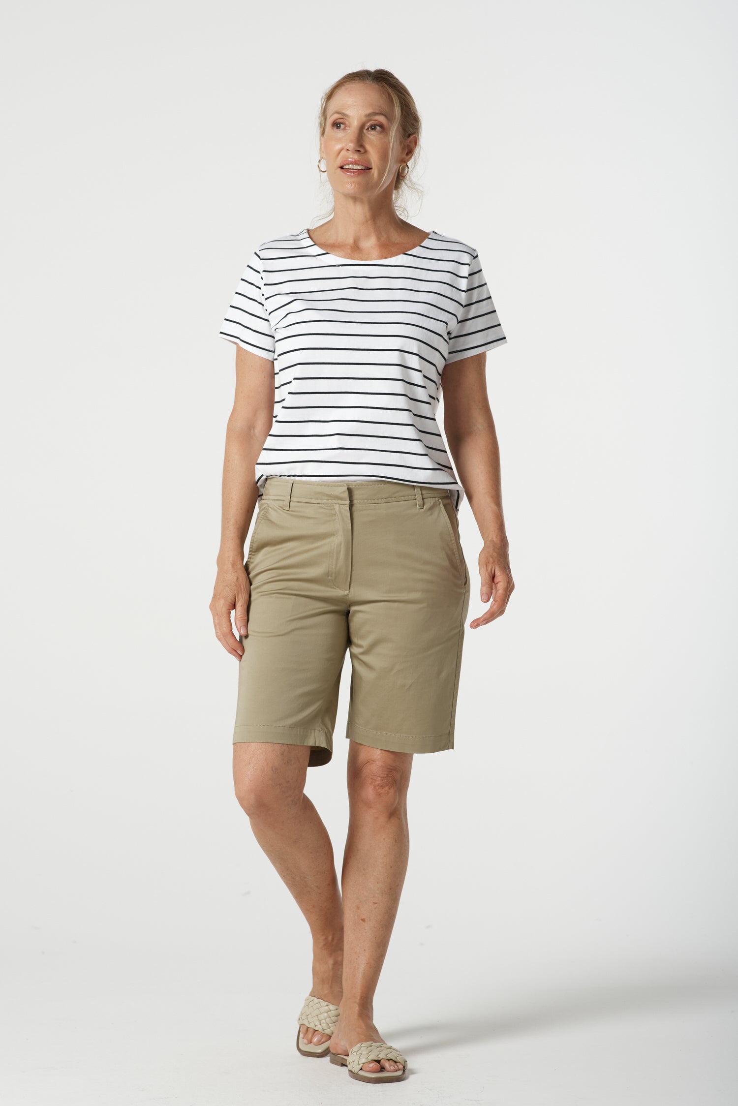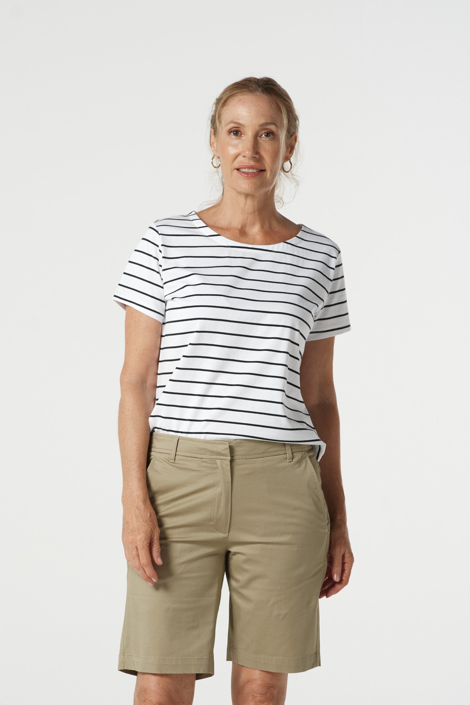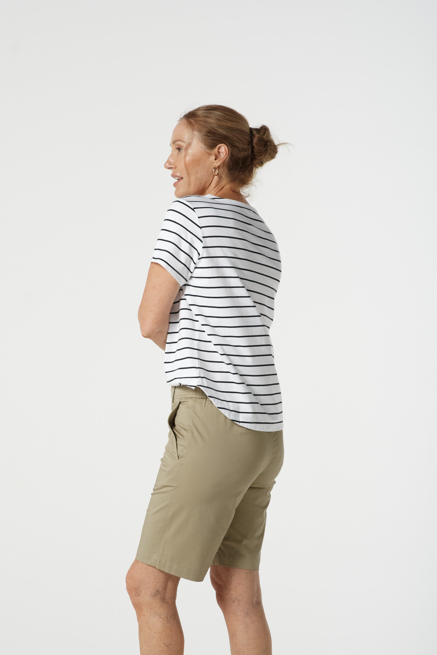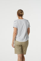 The Relax Cotton Tee in Navy & White is crafted from 100% pima cotton jersey in a premium yarn-dyed stripe for softness and breathability. The perfect basic tee reimagined in modern colours, it features a boat neckline with contrast facing, a curved hem and contrast hem detail, making it an easy go-to with denim, shorts or skirts.