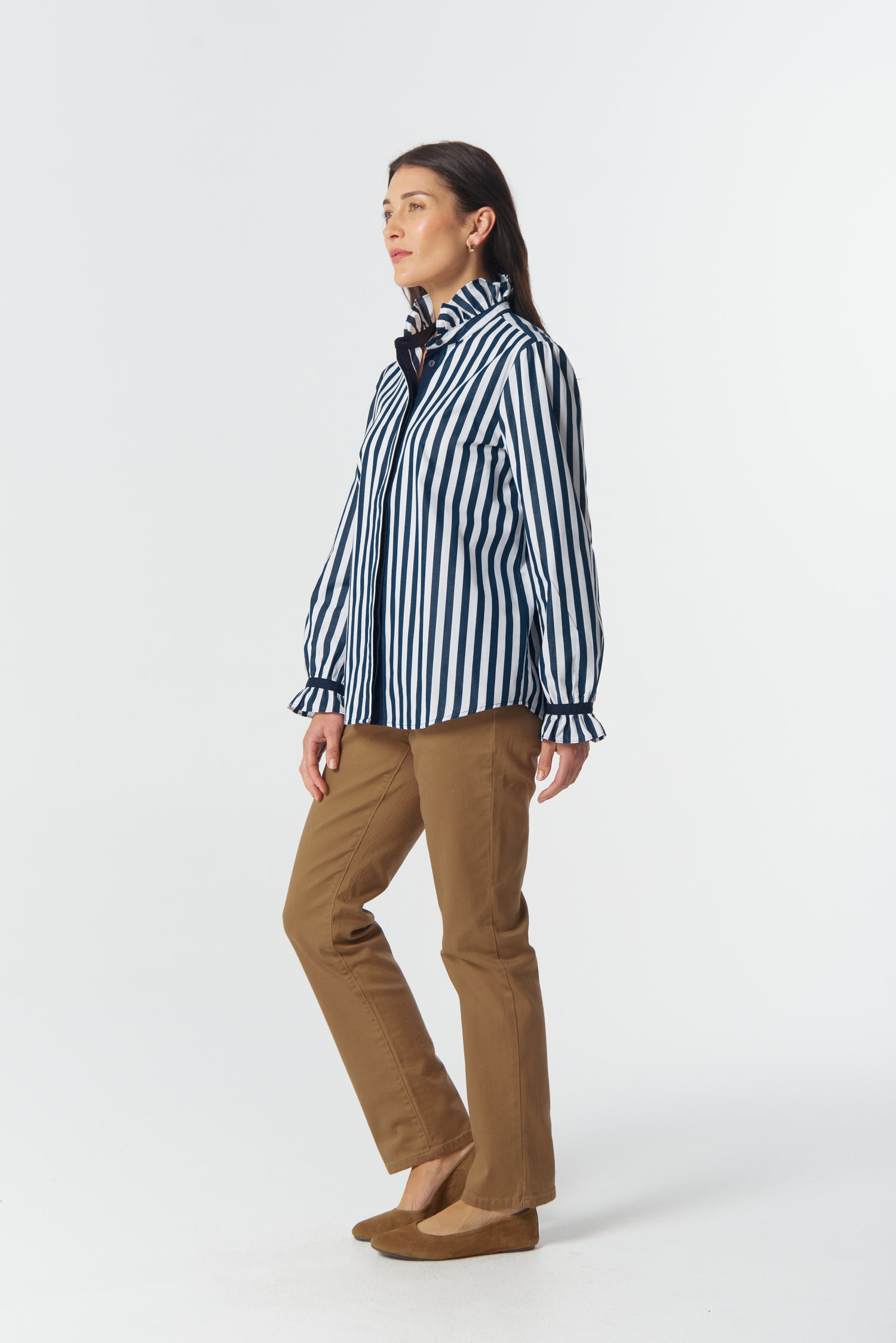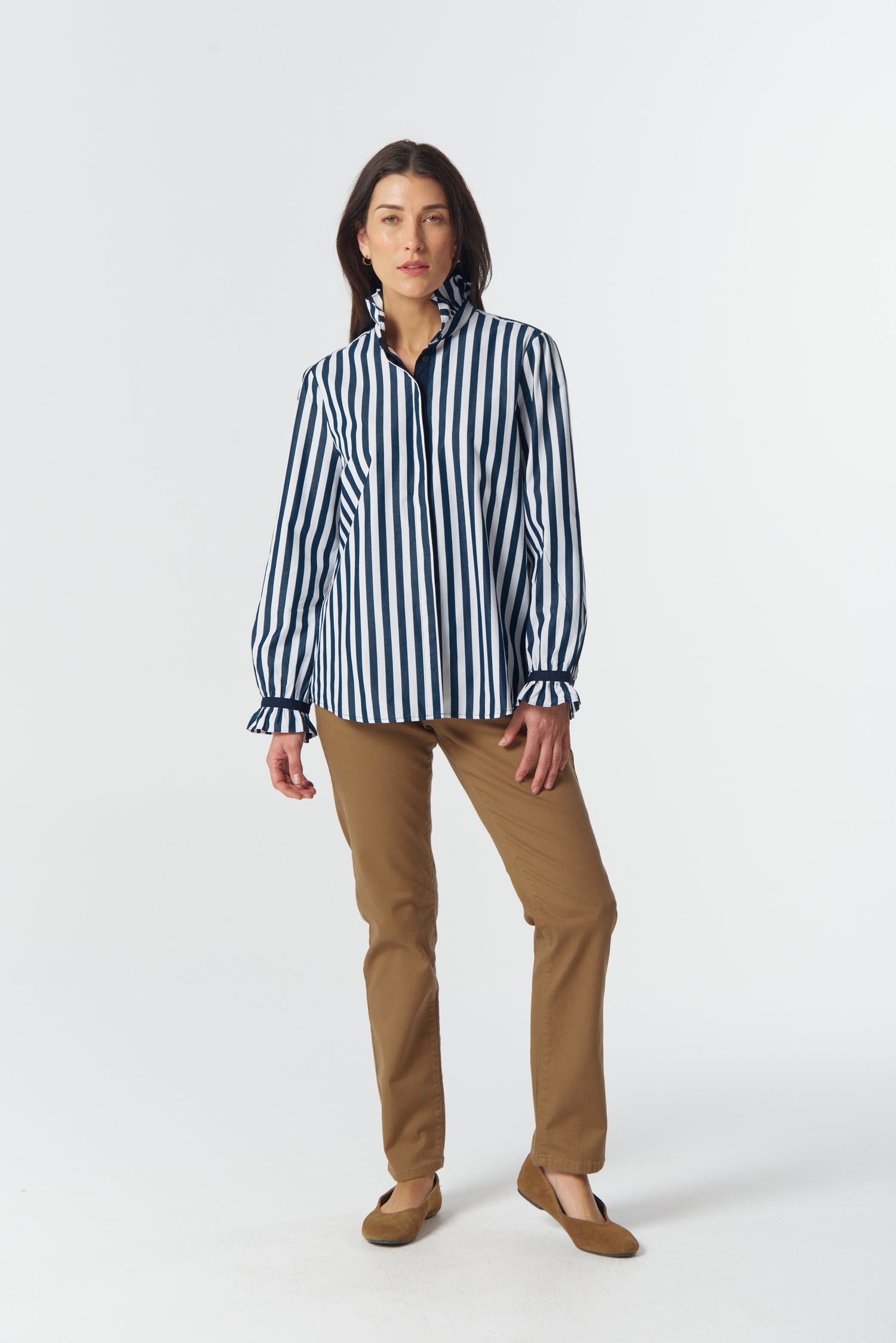 Sky Frill Neck Cotton Shirt - Dark Navy/White