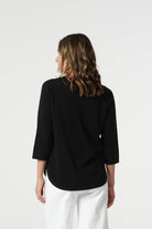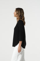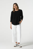 The Sorbet Cotton 3/4 Sleeve Raglan Knit in black is crafted from 100% cotton with a soft textured finish. Designed in a regular fit with a crew neckline, raglan 3/4 sleeves and a shaped hemline. Layering easily with denim, skirts or linen pants.