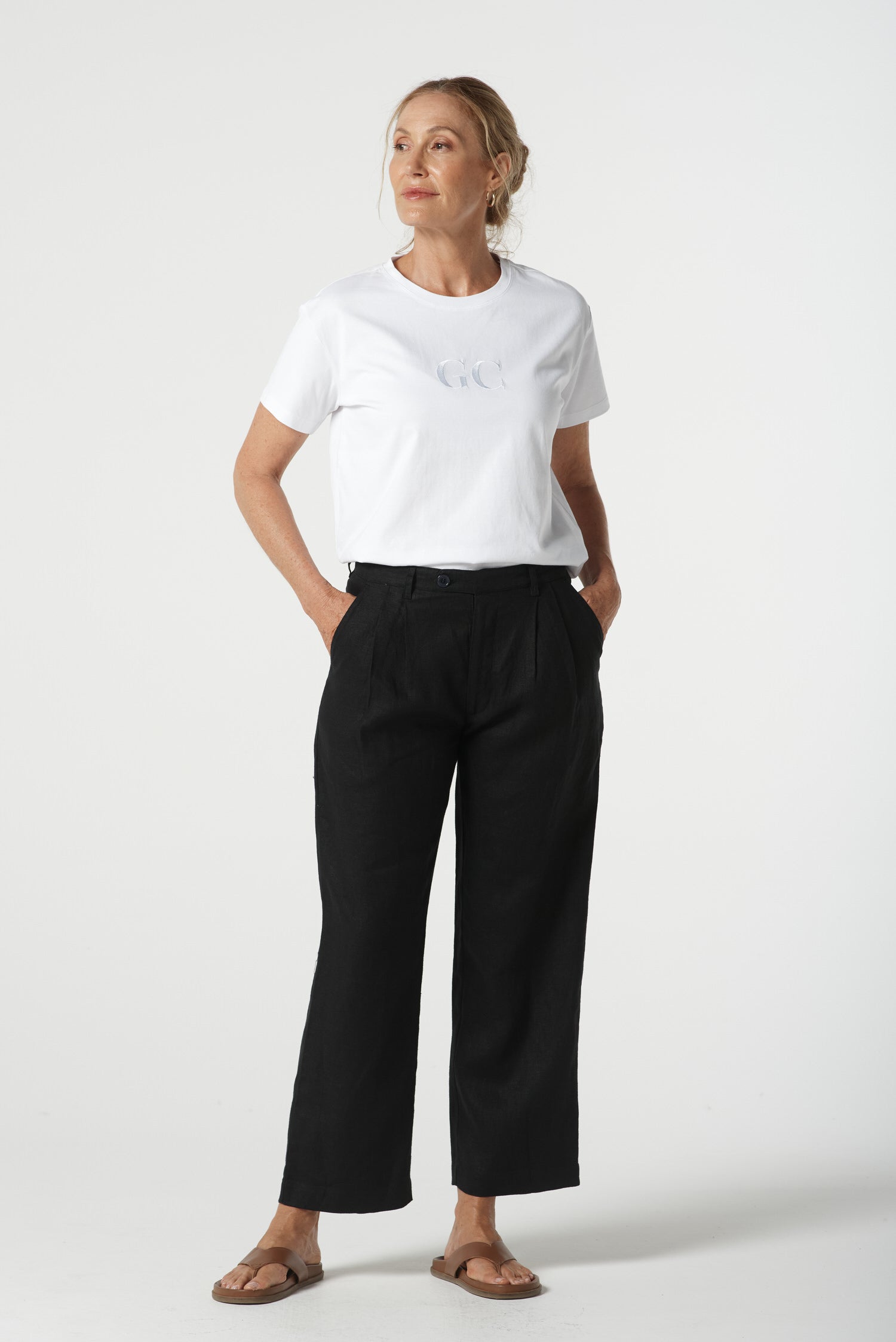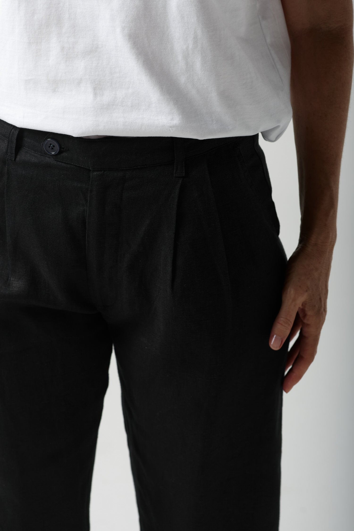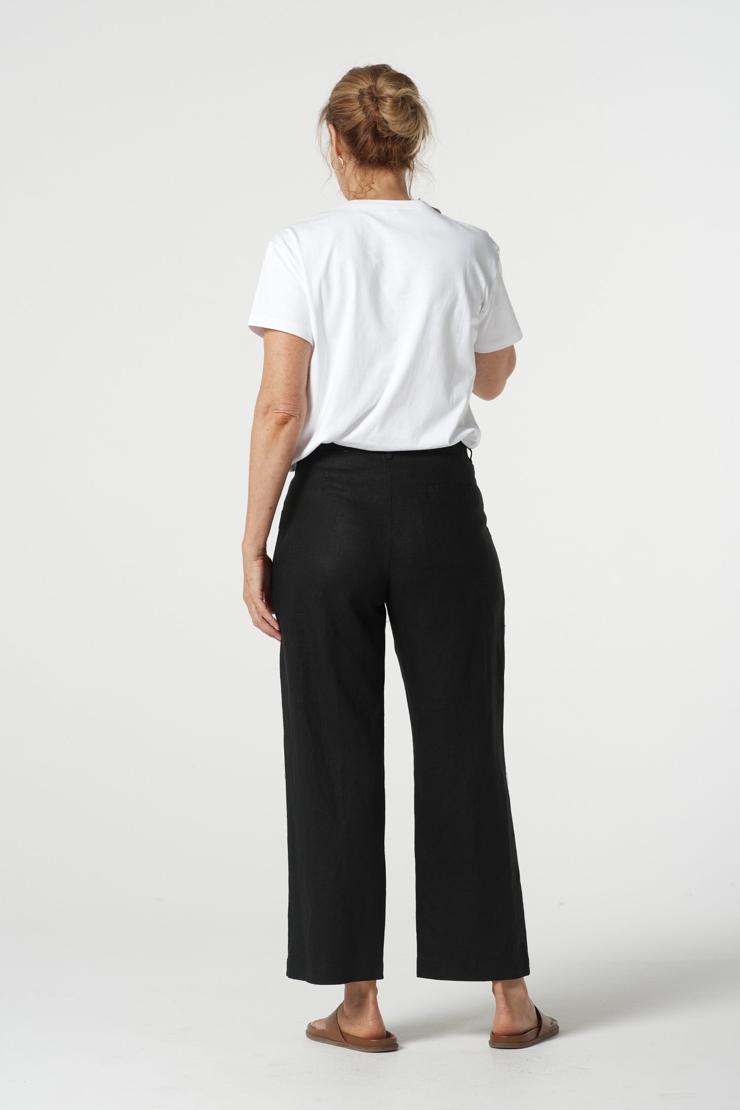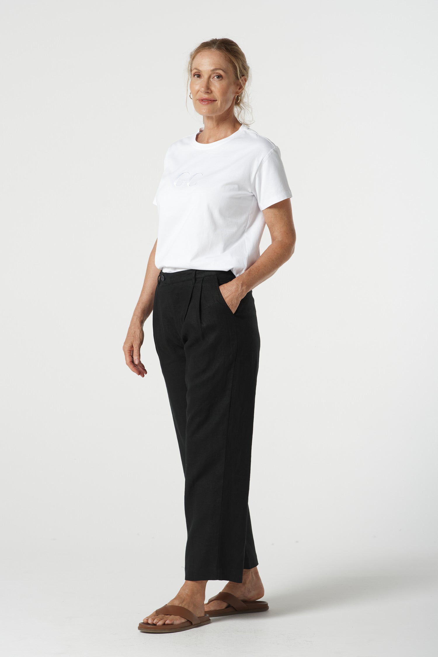 Our Staple Tailored Linen Pant in black is crafted from a breathable linen-cotton blend that offers comfort with a polished finish. Featuring a straight-leg cut and tailored detailing, it’s a versatile wardrobe essential that pairs effortlessly with shirts, knits or relaxed tees.