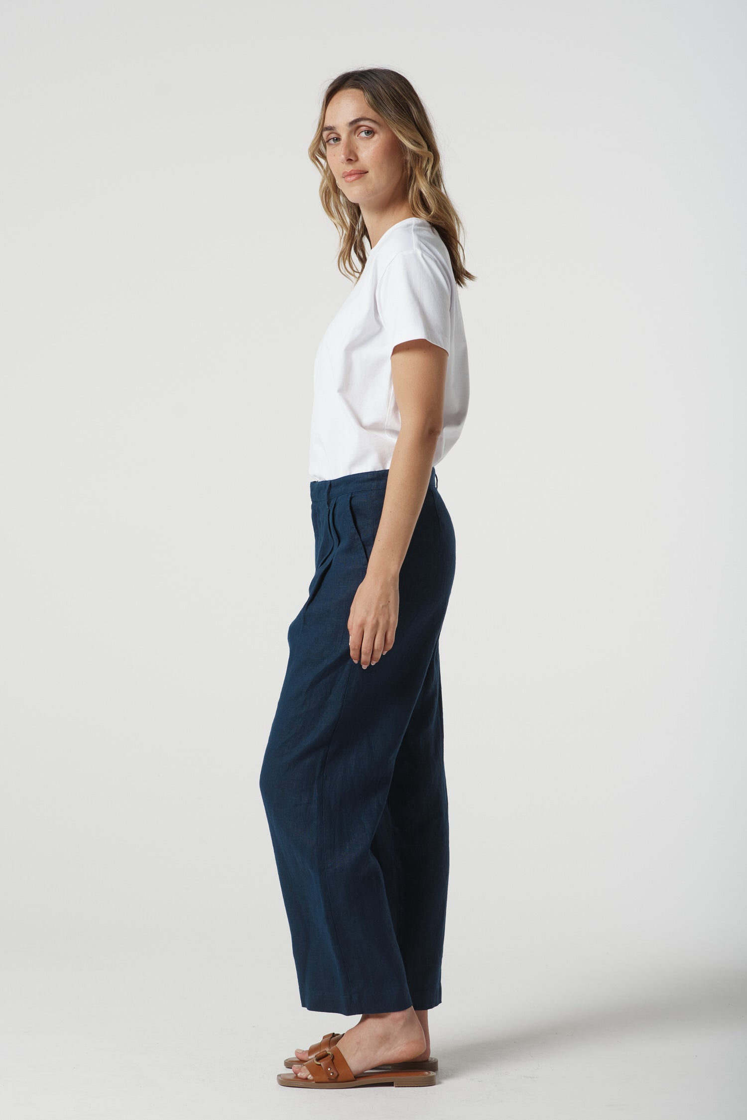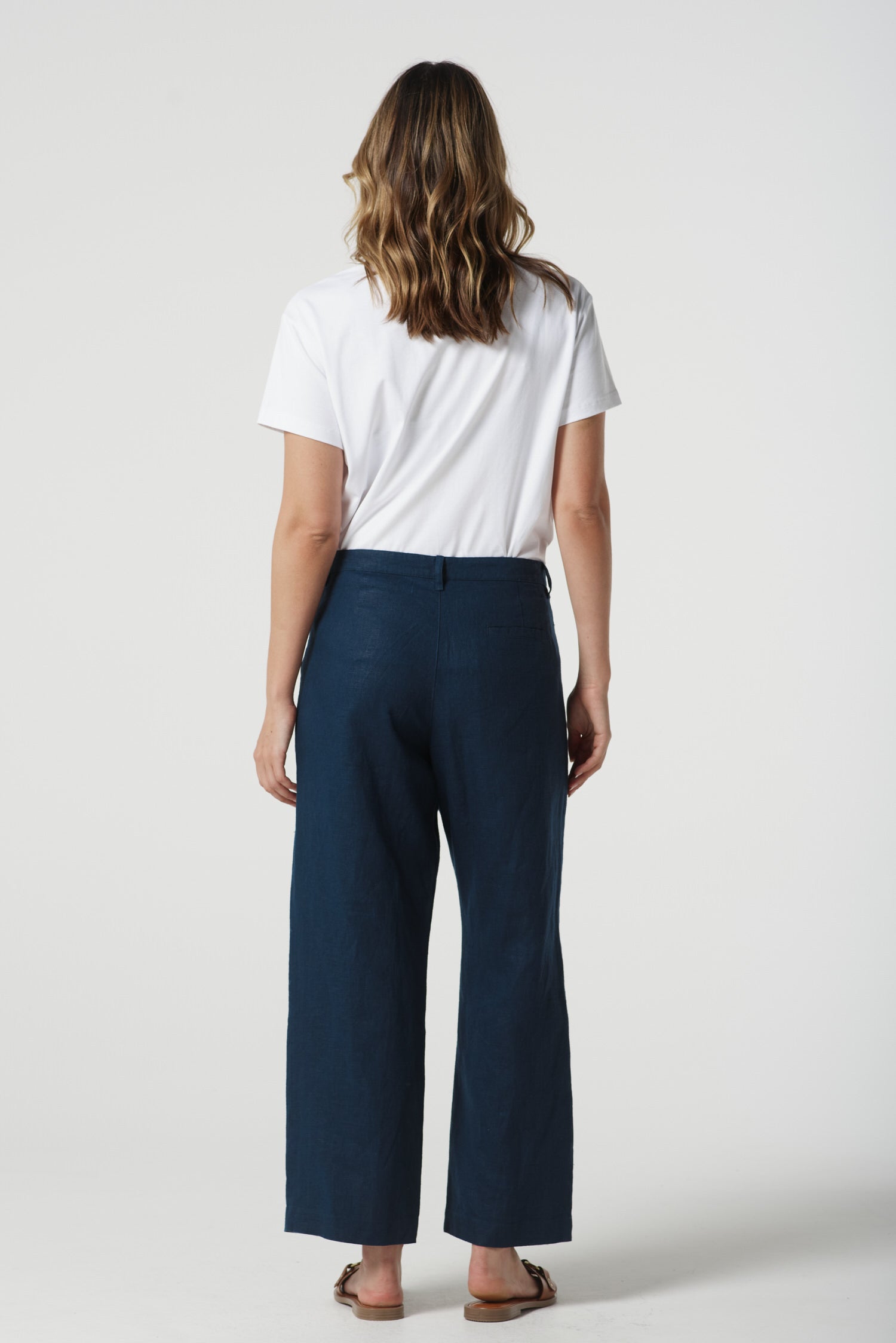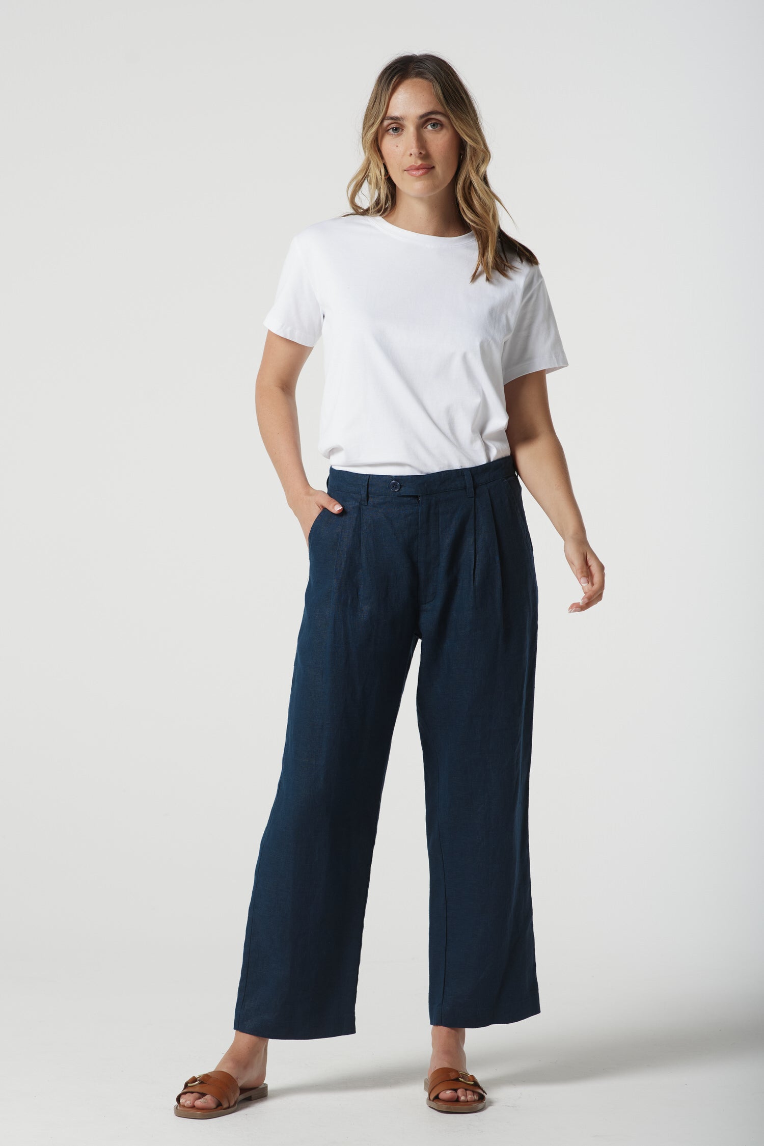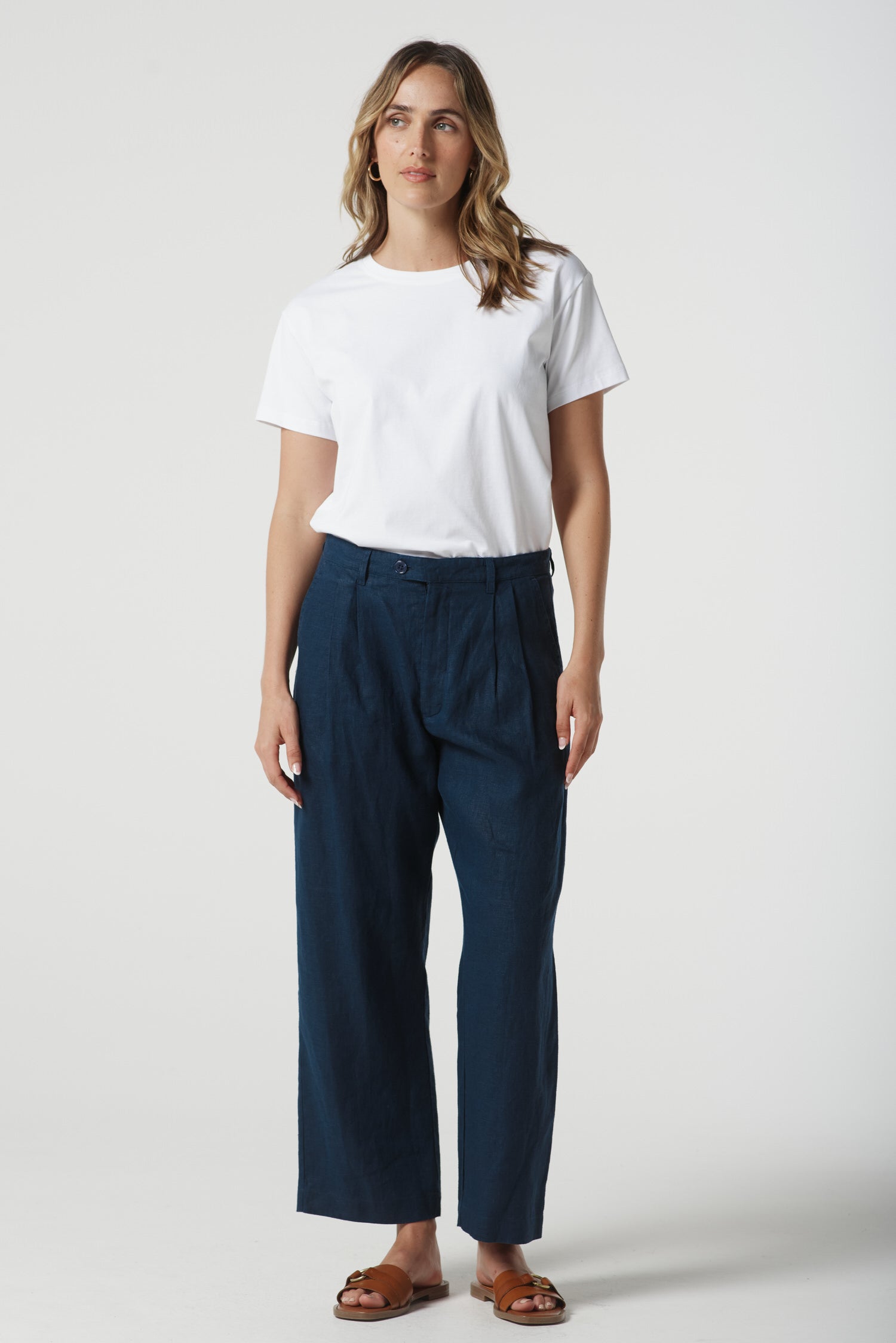 Our Staple Tailored Linen Pant in dark navy is crafted from a breathable linen-cotton blend that offers comfort with a polished finish. Featuring a straight-leg cut and tailored detailing, it’s a versatile wardrobe essential that pairs effortlessly with shirts, knits or relaxed tees.