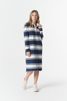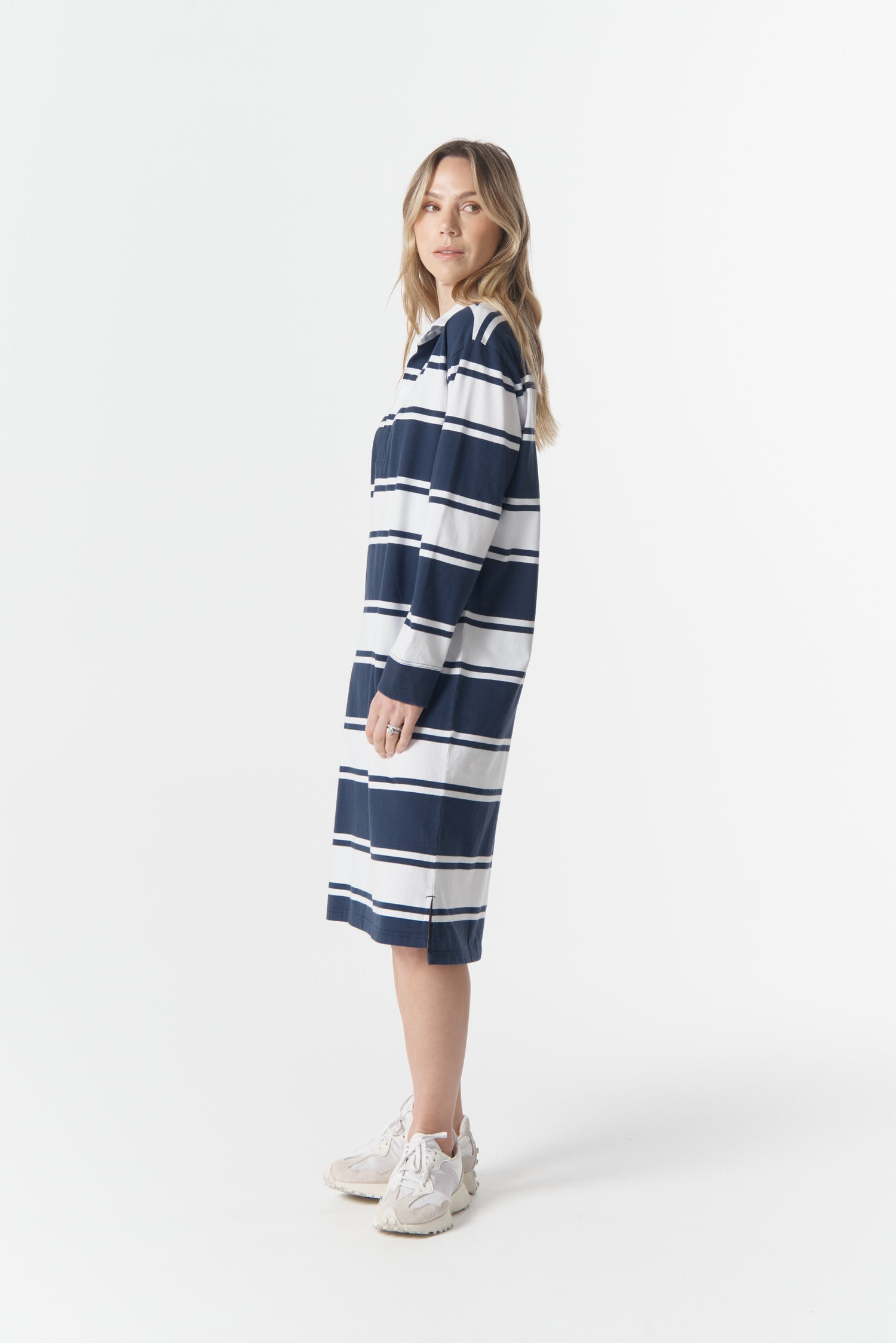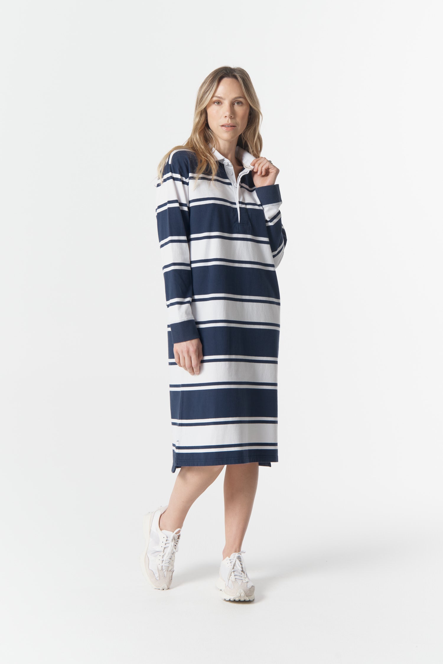 A rugby dress with a bold colour contrast. Soft cotton, relaxed shape, everyday wear.