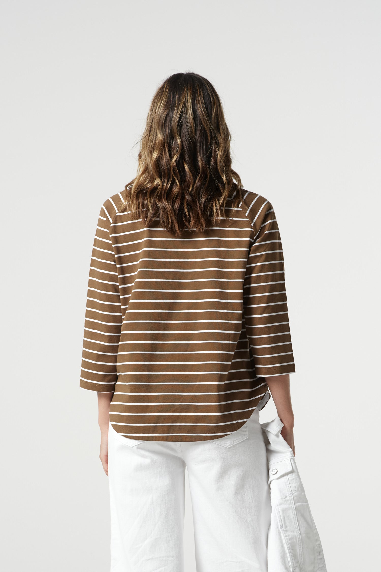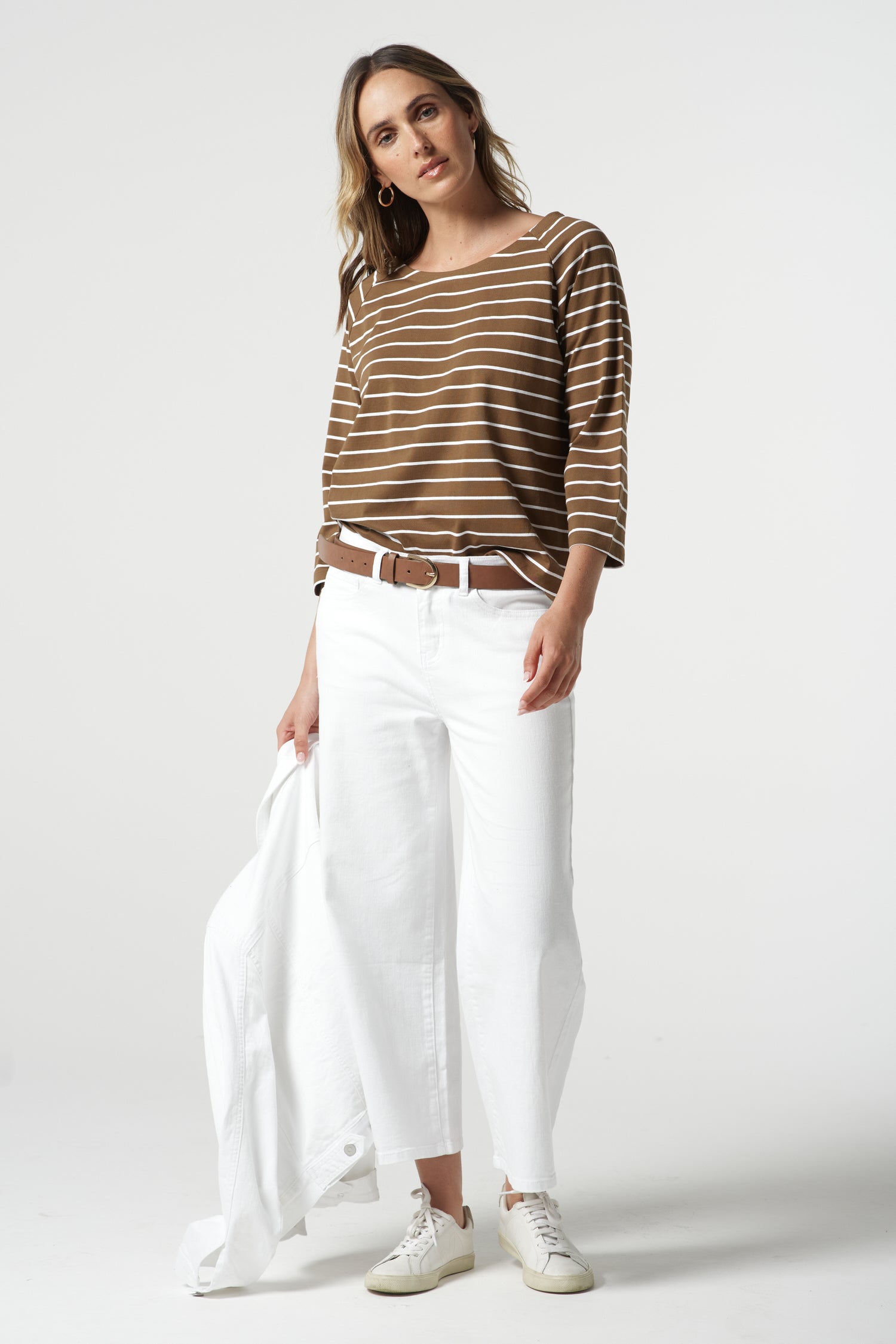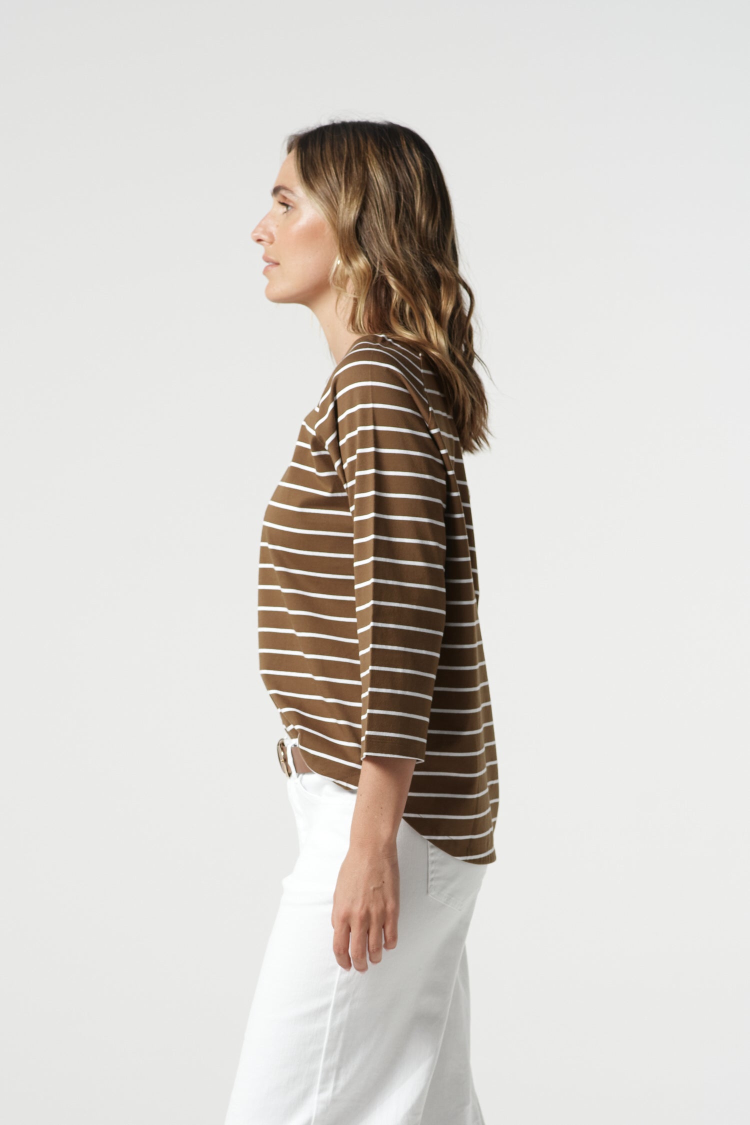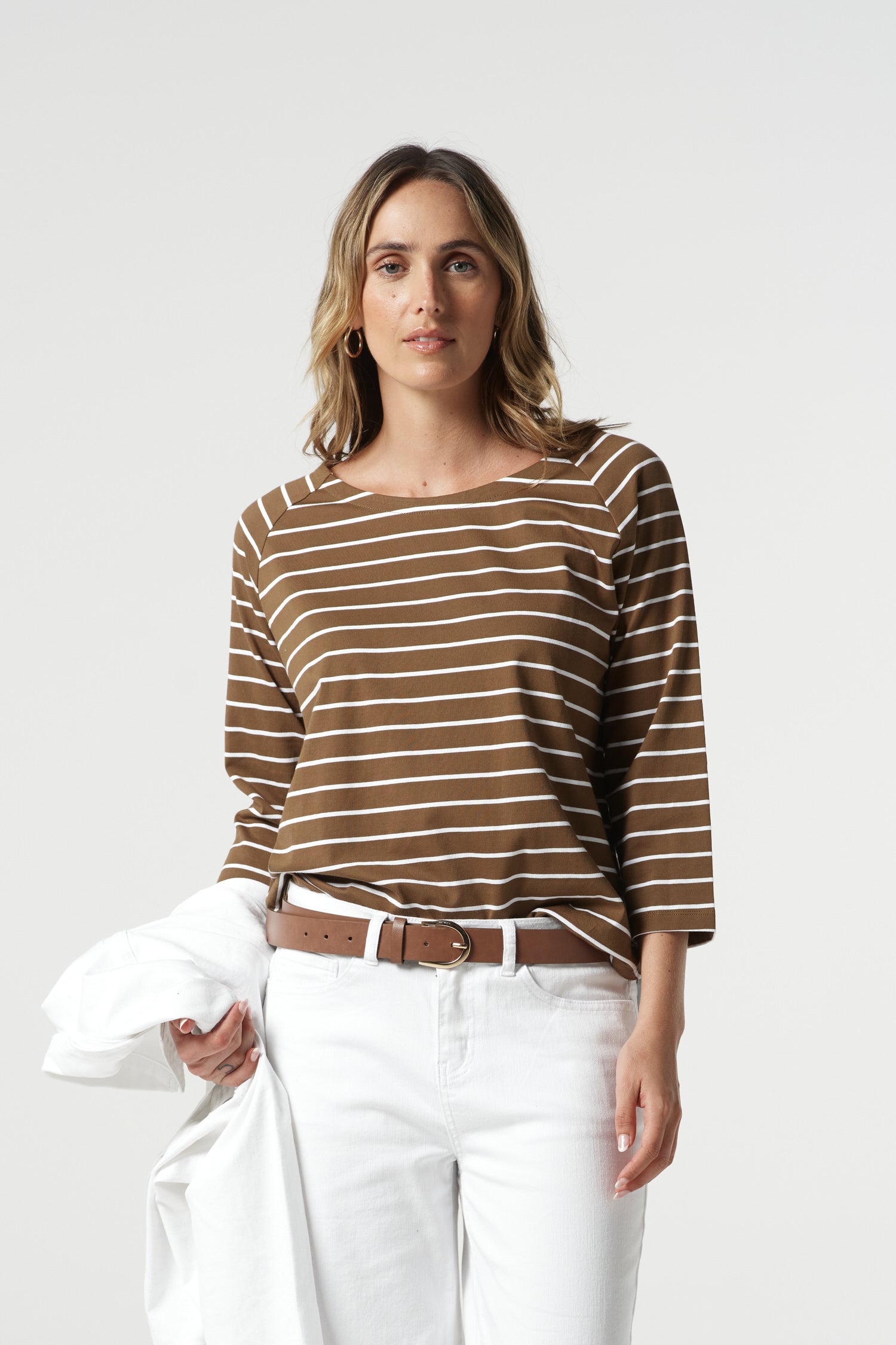 The Unwind Cotton 3/4 Sleeve Tee in Otter and white is crafted from 100% pima cotton jersey in a premium yarn-dyed stripe. With a boat neckline, raglan 3/4 sleeves, curved hem and regular fit, it’s our favourite shape for spring — light, breathable and easy to pair with denim, shorts or skirts.