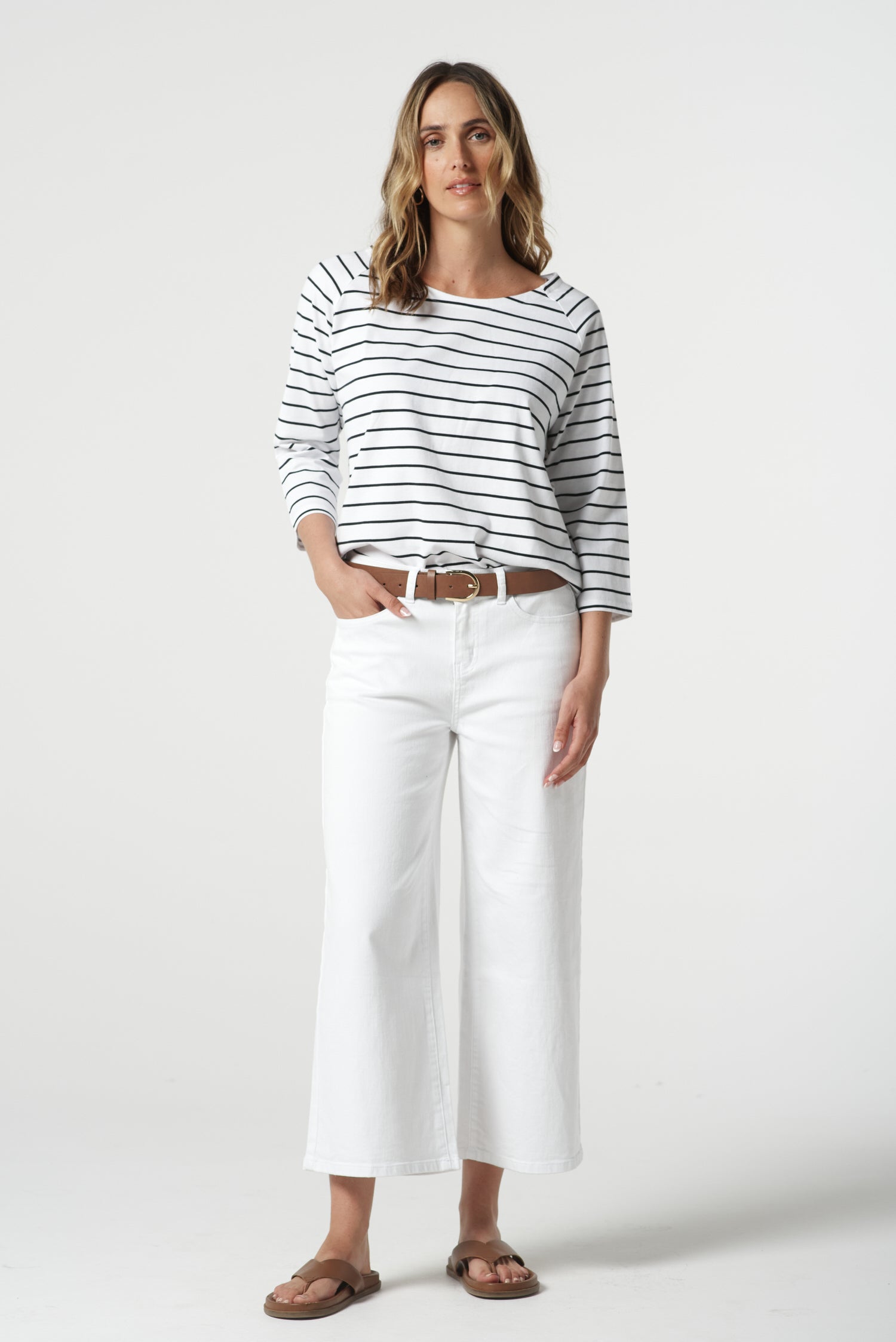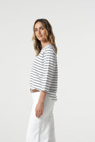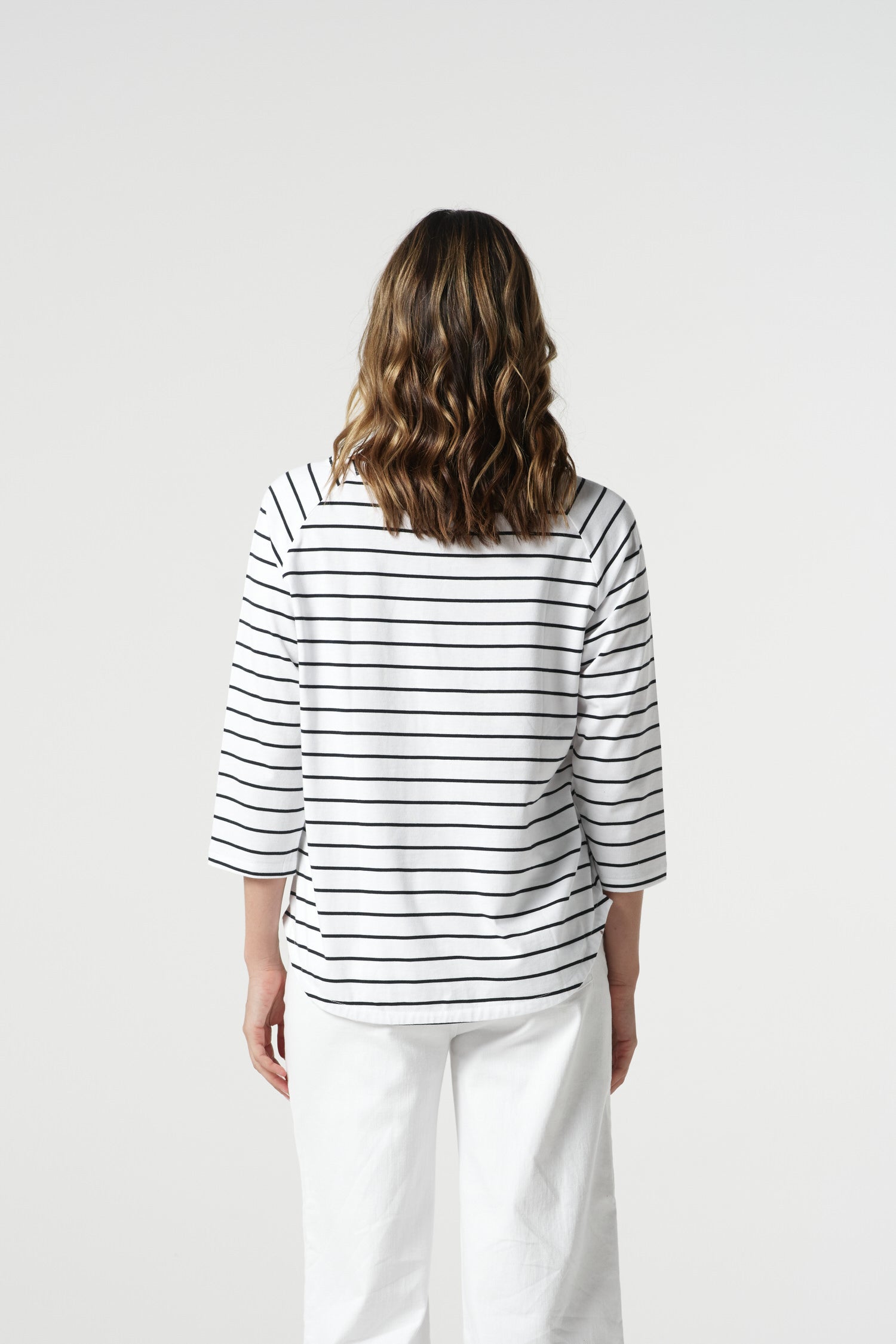 The Unwind Cotton 3/4 Sleeve Tee in white and navy is crafted from 100% pima cotton jersey in a premium yarn-dyed stripe. With a boat neckline, raglan 3/4 sleeves, curved hem and regular fit, it’s our favourite shape for spring — light, breathable and easy to pair with denim, shorts or skirts.