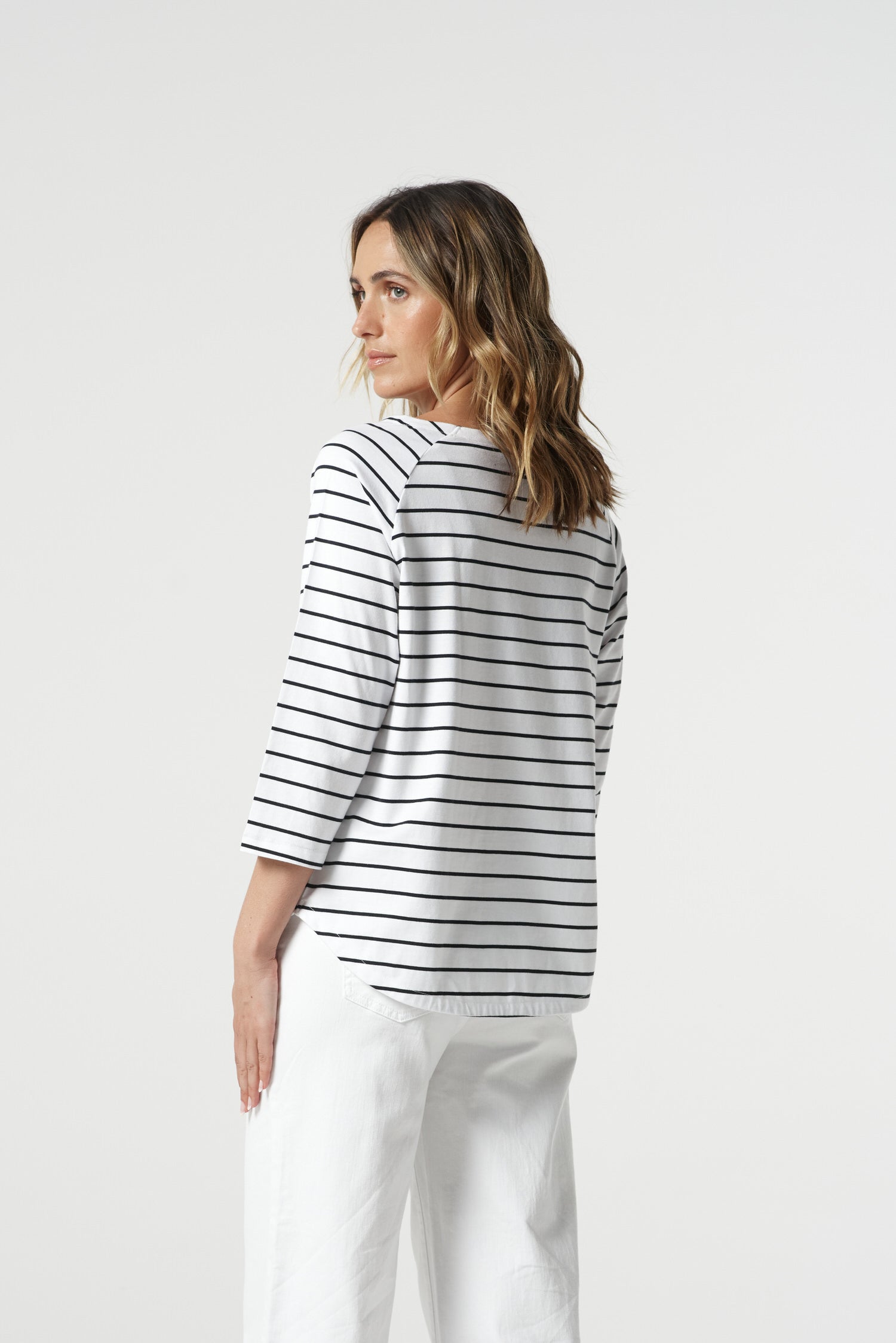 The Unwind Cotton 3/4 Sleeve Tee in white and navy is crafted from 100% pima cotton jersey in a premium yarn-dyed stripe. With a boat neckline, raglan 3/4 sleeves, curved hem and regular fit, it’s our favourite shape for spring — light, breathable and easy to pair with denim, shorts or skirts.