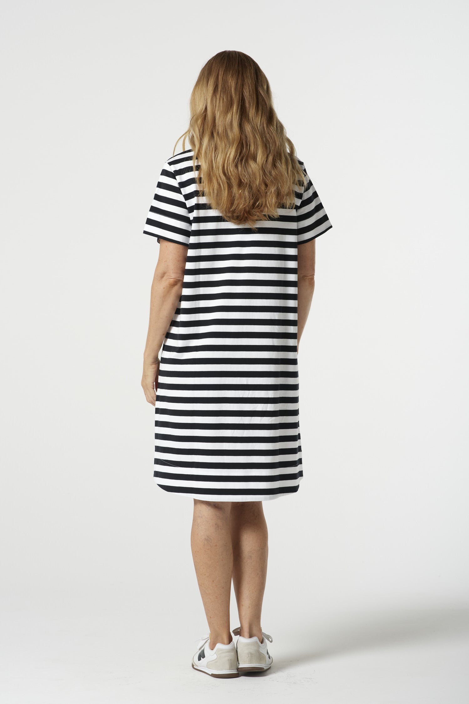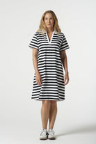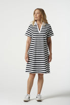 The V Neck Cotton Jersey Dress in navy and white is crafted from 100% pima cotton jersey in a premium yarn-dyed stripe. A new cool heritage style, it features a contrast placket, curved hem and contrast hem facing, bringing a fresh modern edge to a timeless everyday dress.
